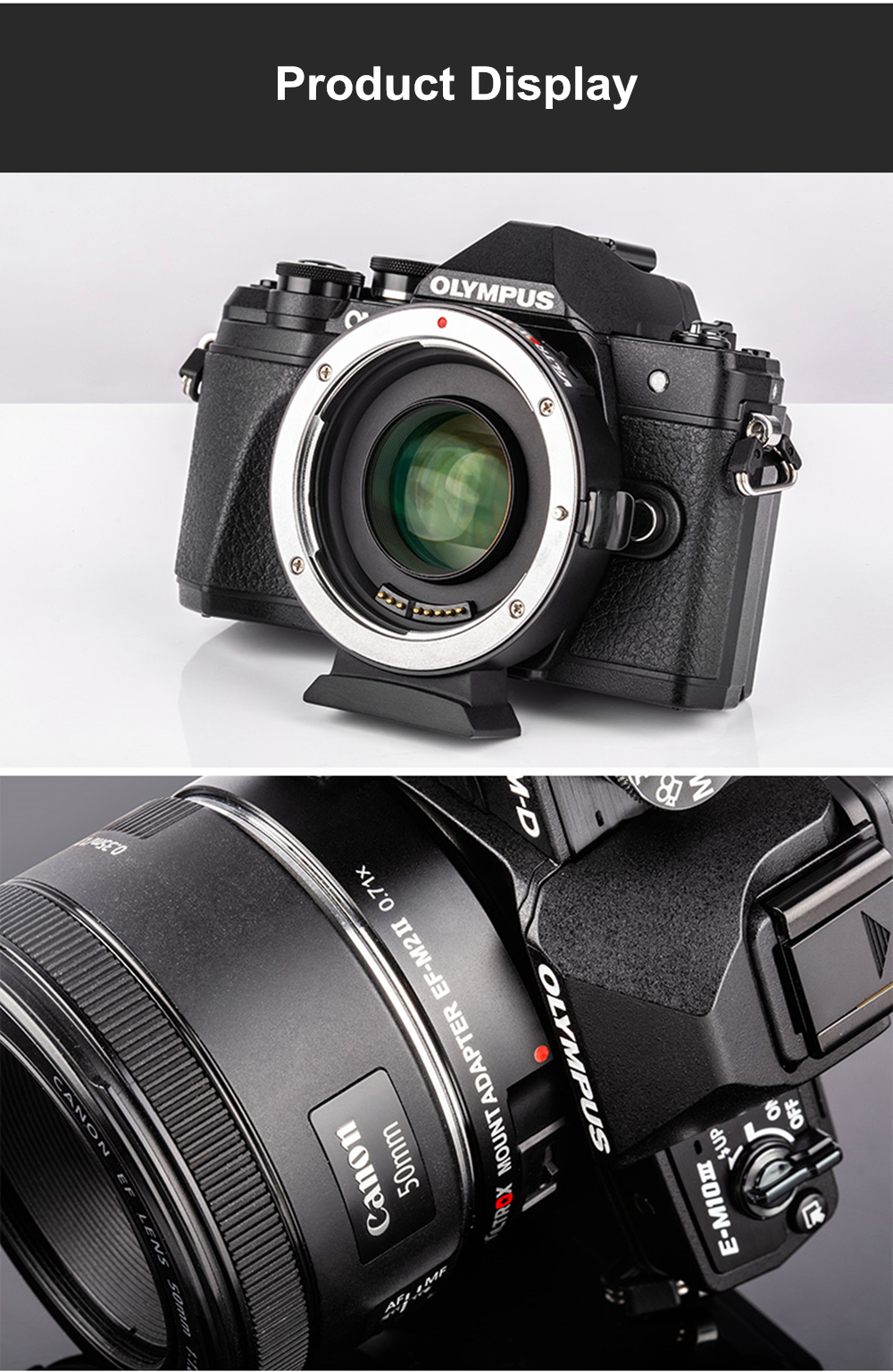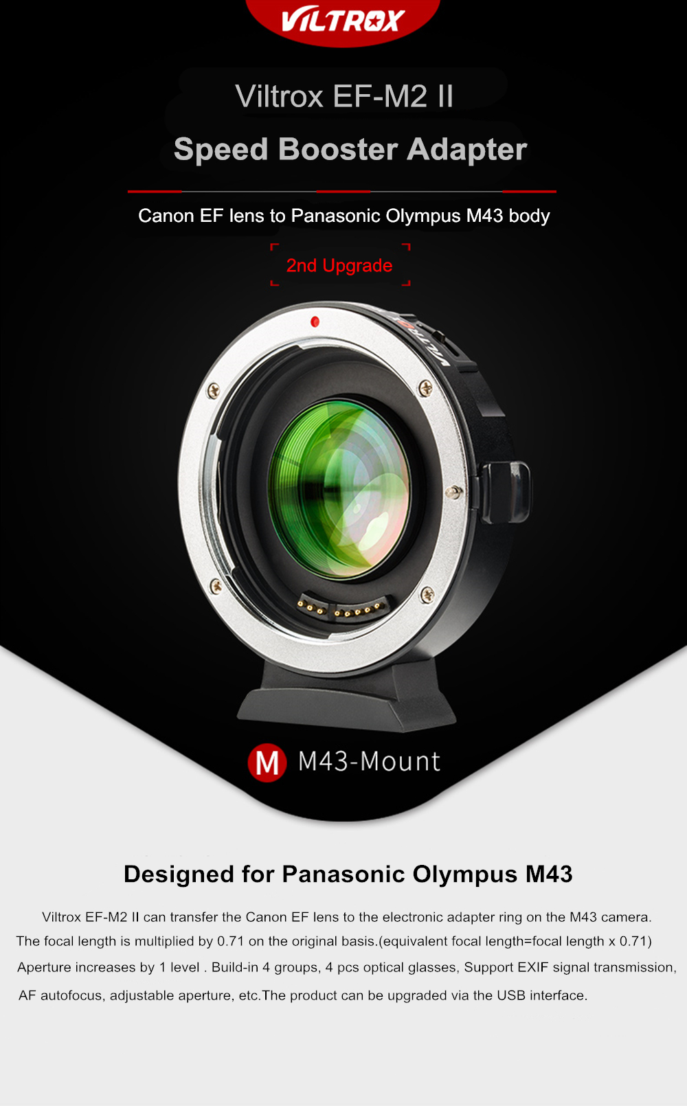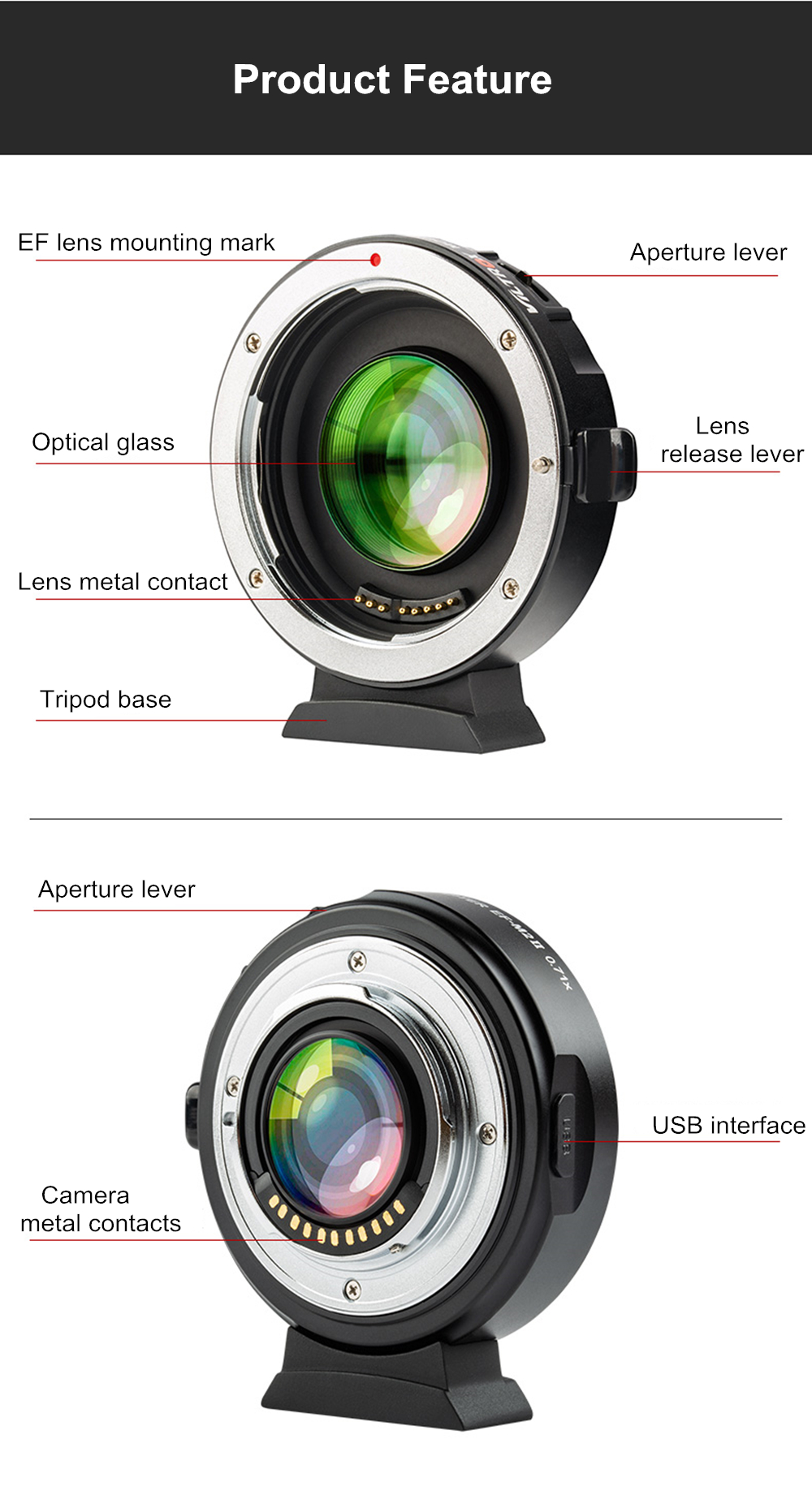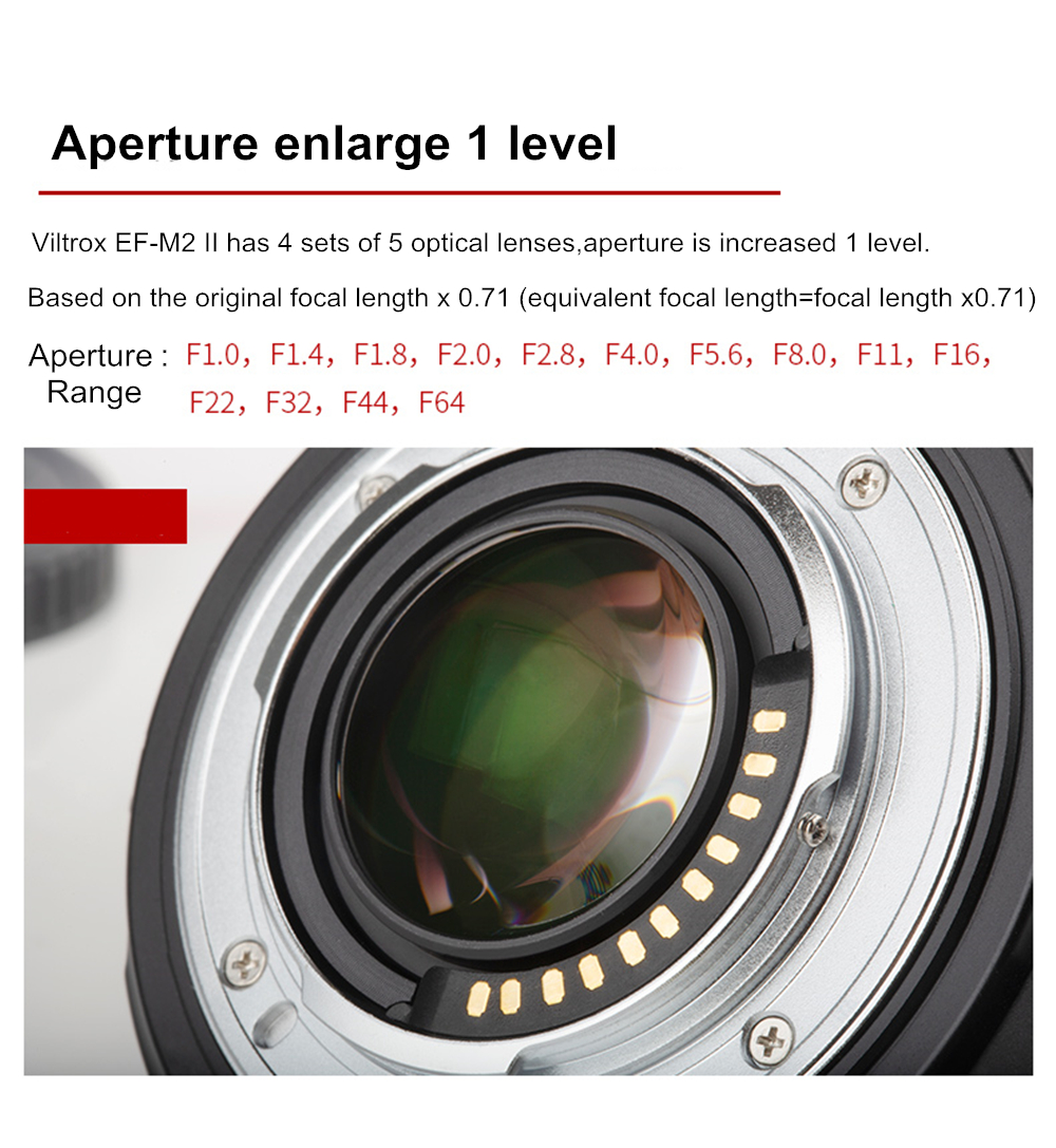 Viltrox EF-M2II mount adapter ist entwickelt, um damit Canon EF-mount serie objektiv verwendet werden auf M43 kamera. Plus 0,71 basierend auf die original brennweite (äquivalent brennweite = brennweite x0.71), die helfen vergrößern 1 ebene blende. Build-in 4 gruppen, 4 stücke optische gläser, AF (autofokus) und einstellbare blende, etc. Zu aktualisieren adapter firmware, neueste firmware kann download von der offiziellen website, verbinden adapter, um computer mit USB kabel und kopieren sie die datei in adapter speicher. Tun nicht erforderlich zu befestigen objektiv oder kamera. Zu ändern AF modus, schalten sie kamera, nehmen sie batterie, einfügen und drehen kamera zurück auf wieder für kamera zu erkennen neue AF modus als neue objektiv. Langsam fokus wird passieren auf low-end linsen in CDAF modus