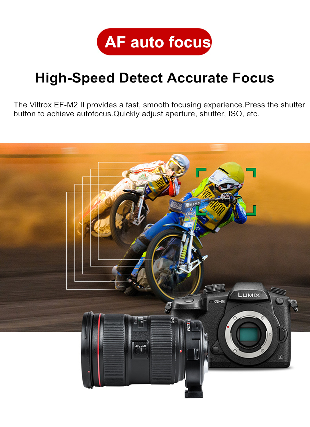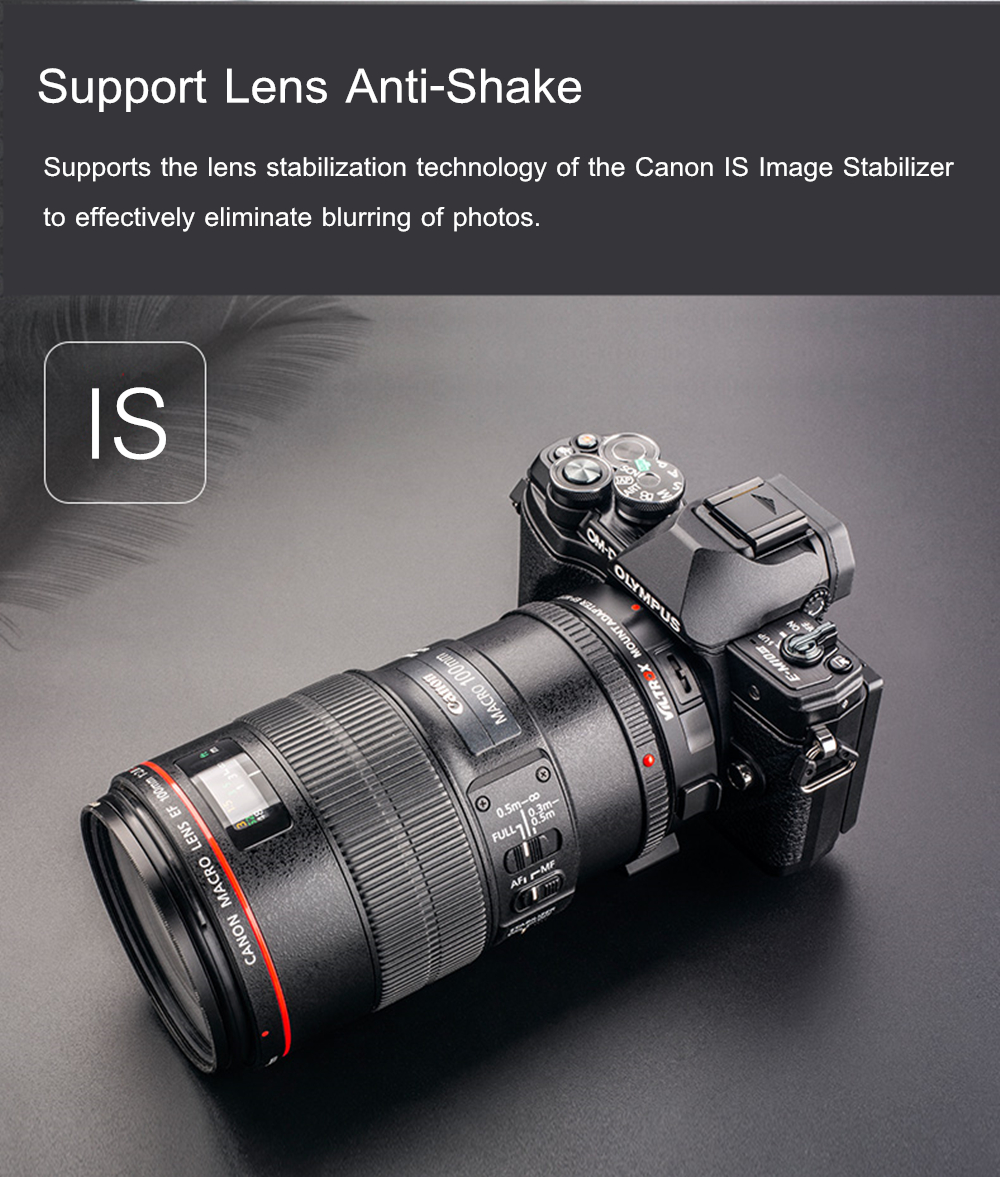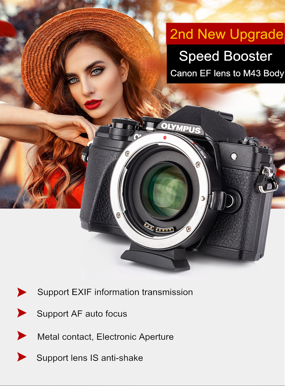Viltrox EF-M2II mount adapter ist entwickelt, um damit Canon EF-mount serie objektiv verwendet werden auf M43 kamera. Plus 0,71 basierend auf die original brennweite (äquivalent brennweite = brennweite x0.71), die helfen vergrößern 1 ebene blende. Build-in 4 gruppen, 4 stücke optische gläser, AF (autofokus) und einstellbare blende, etc. Zu aktualisieren adapter firmware, neueste firmware kann download von der offiziellen website, verbinden adapter, um computer mit USB kabel und kopieren sie die datei in adapter speicher. Tun nicht erforderlich zu befestigen objektiv oder kamera. Zu ändern AF modus, schalten sie kamera, nehmen sie batterie, einfügen und drehen kamera zurück auf wieder für kamera zu erkennen neue AF modus als neue objektiv. Langsam fokus wird passieren auf low-end linsen in CDAF modus