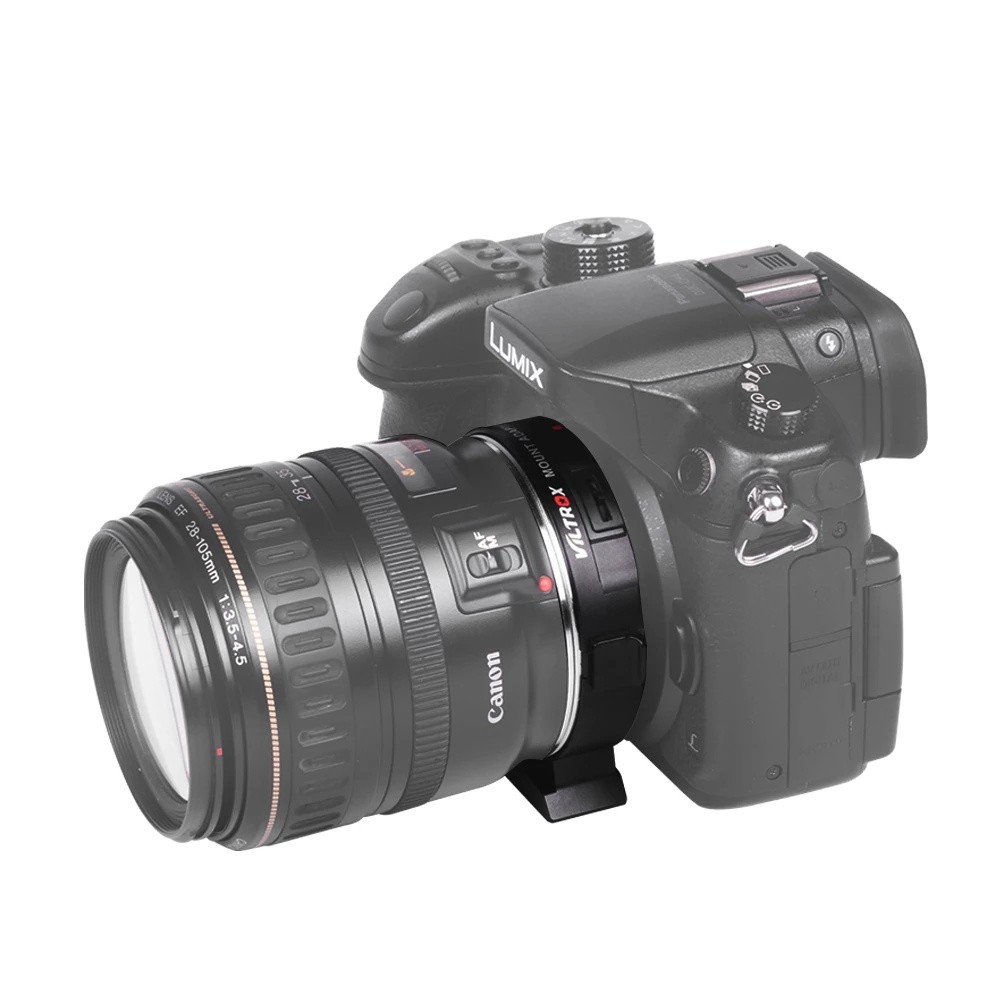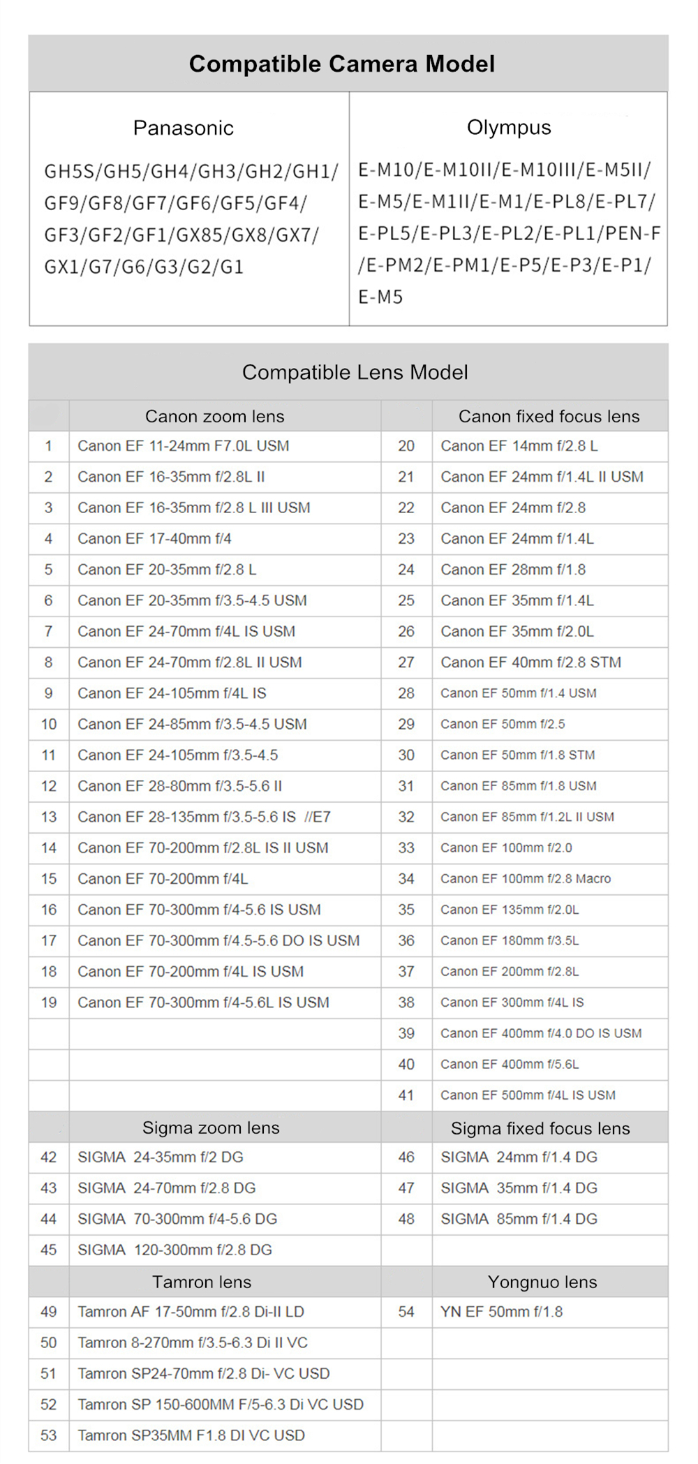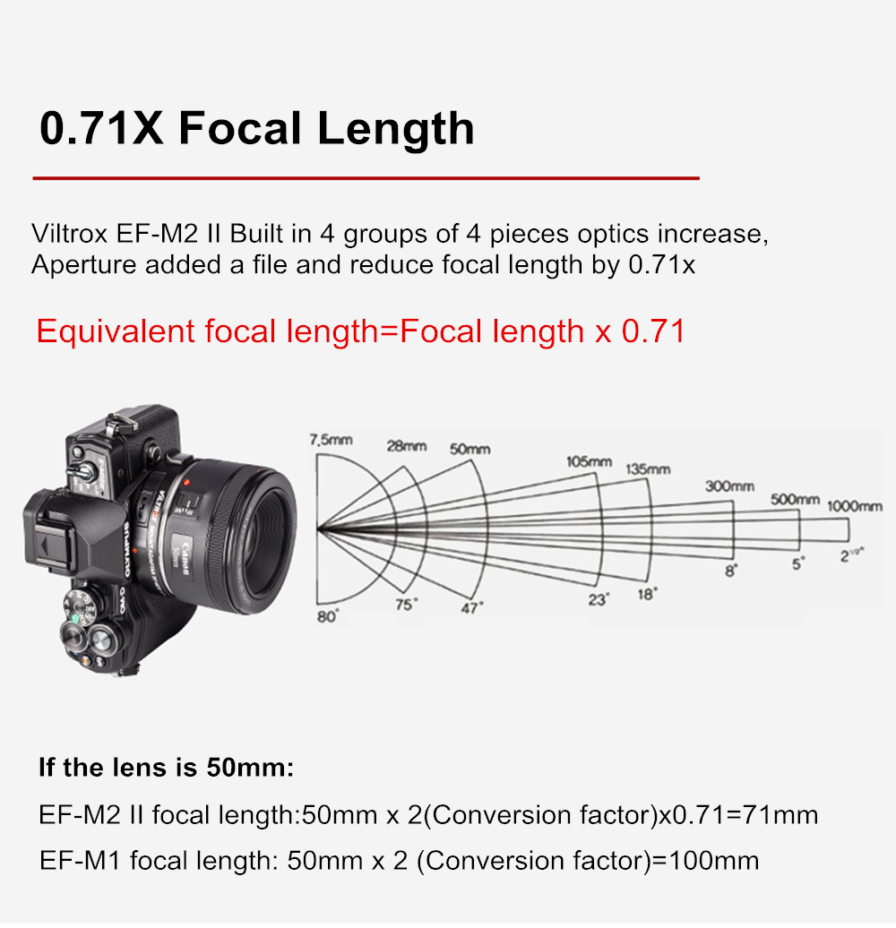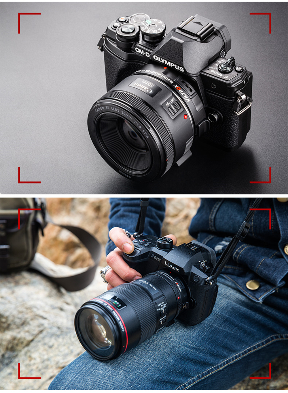 Viltrox EF-M2II mount adapter ist entwickelt, um damit Canon EF-mount serie objektiv verwendet werden auf M43 kamera. Plus 0,71 basierend auf die original brennweite (äquivalent brennweite = brennweite x0.71), die helfen vergrößern 1 ebene blende. Build-in 4 gruppen, 4 stücke optische gläser, AF (autofokus) und einstellbare blende, etc. Zu aktualisieren adapter firmware, neueste firmware kann download von der offiziellen website, verbinden adapter, um computer mit USB kabel und kopieren sie die datei in adapter speicher. Tun nicht erforderlich zu befestigen objektiv oder kamera. Zu ändern AF modus, schalten sie kamera, nehmen sie batterie, einfügen und drehen kamera zurück auf wieder für kamera zu erkennen neue AF modus als neue objektiv. Langsam fokus wird passieren auf low-end linsen in CDAF modus