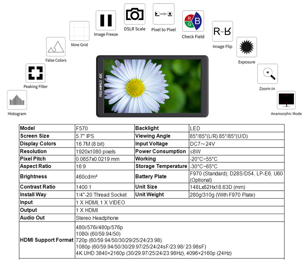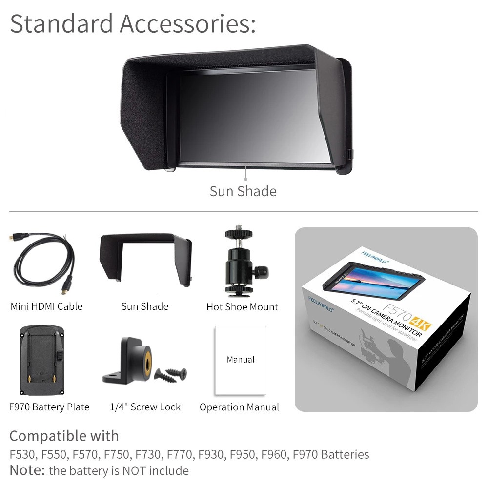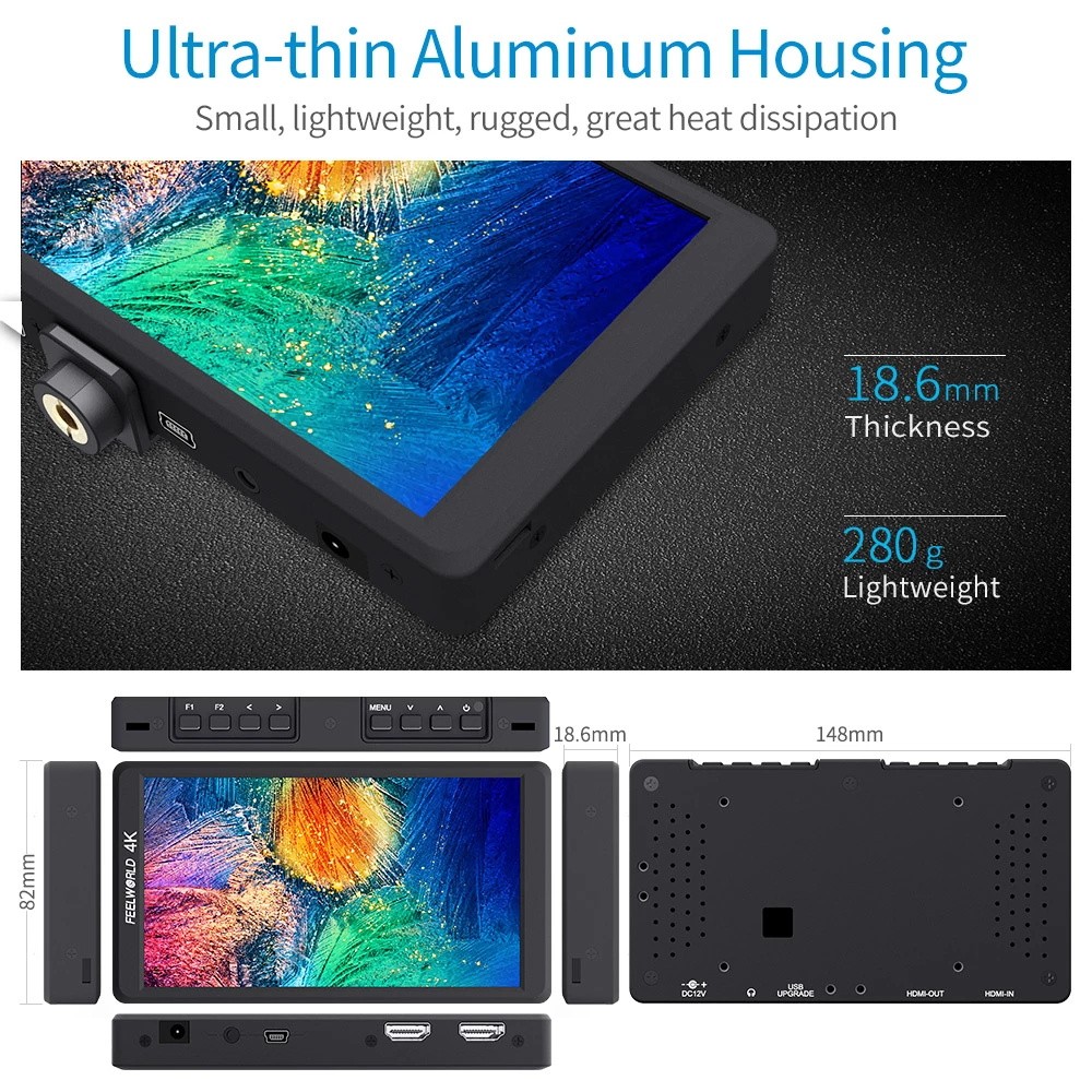 FEELWORLD F570 ist marmelade verpackt mit eigenschaften in einem kleinen, leichten paket. Es ist ausgestattet mit 4K HDMI eingang und ausgang interface, so können sie verbinden monitor zu verschiedenen 4K kamera, sie können auch 4K HDMI video signal synchronisation ausgang, bequemlichkeit direktor und fotograf überwachung zur gleichen zeit. Sie können auch monitor audio mit die 3,5mm stereo kopfhörer jack.