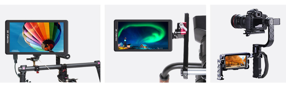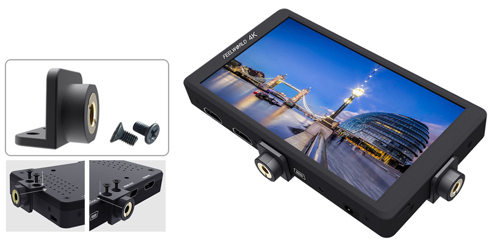 FEELWORLD F570 eigenschaften standard 1/4 "mount punkte für befestigung es zu kameras und rigs. Die externe 1/4 schraube design ist verwendet zu machen die monitor leichter und dünner. Mit die 1/4 zoll loch, sie können sitzen auf eine tabelle mit dem gebaut in kick stehen oder sicher befestigen es zu die top von ihre kamera als die ultimative HD sucher!