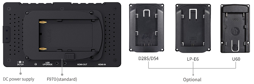 Für power, es ist ein 12V DC eingang auf die seite und raum für eine batterie platte auf der rückseite. Wenn an die 12V DC eingang sie erhalten kontinuierliche power oder sie können run es off von kompatibel akku. Und die F570 unterstützt F970 (standard), D28S/D54, LP-E6 und U60 batterie platte von ihre wahl.