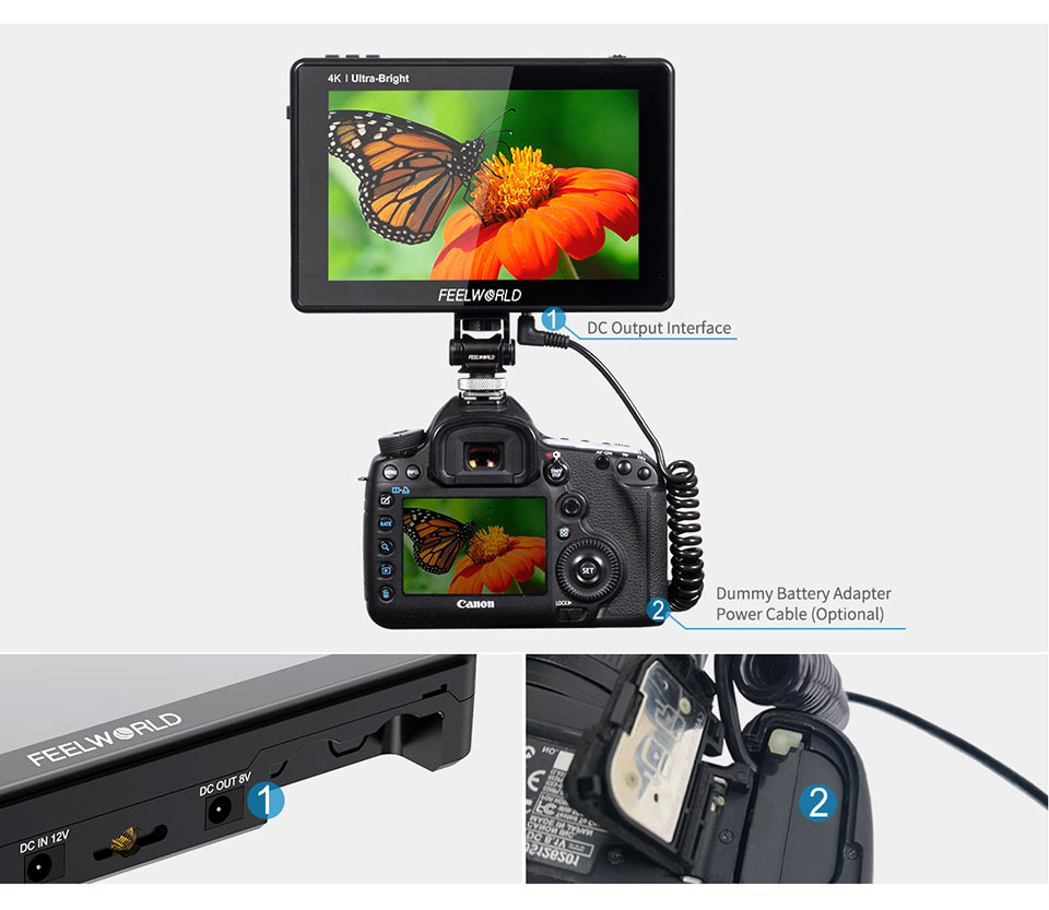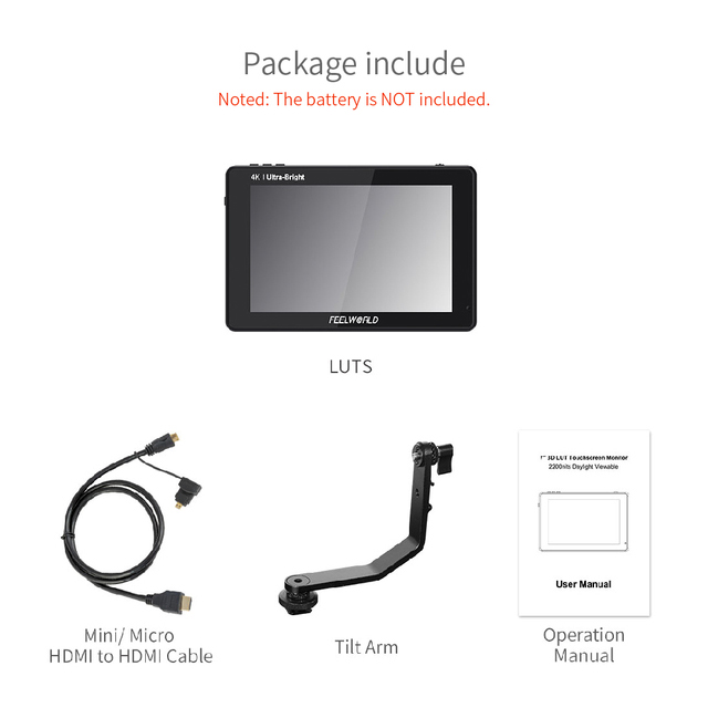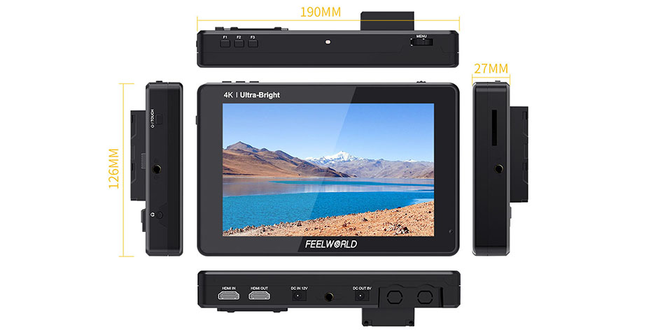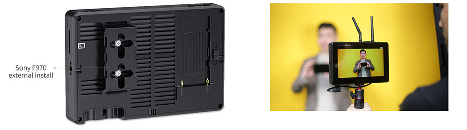 Die LUT7 PRO rüstet sich filmemacher mit die vorteile von eine große auf-kamera display ohne, der die kamera set up sich umständlich. FEELWORLD LUT7 PRO ist verpackt mit high-end überwachung eigenschaften in eine kleine, leichten paket, das können verbunden werden, um praktisch jede kamera. Die vordere eigenschaften eine große hohe auflösung, tageslicht sichtbar LCD touchscreen, es sind video verbindungen auf der unterseite und SD card slot auf der seite. Es sind eine F970 batterie platte und eine installieren/wie drahtlose sender, LED licht und andere, die ausgestattet mit Sony F970 batterie platte. Die äußere rahmen eigenschaften standard ¼ "mount punkte auf der unterseite, links und rechts für befestigung es zu kameras und rigs. Diese design detail macht die LUT7 PRO einfach zu befestigen auf eine kamera und einfach zu teilen mit ein team mitglied oder client auf set.