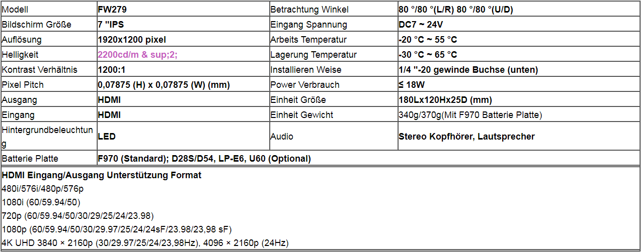 Die FW279 hat umfangreiche überwachung tools, einschließlich histogramm, focus assist, embedded audio, falsche farben, zebra exposition, verhältnis marker, anamorph modus, zoom etc. es könnte ihnen helfen, schaffen die wunderbare aufnahmen.