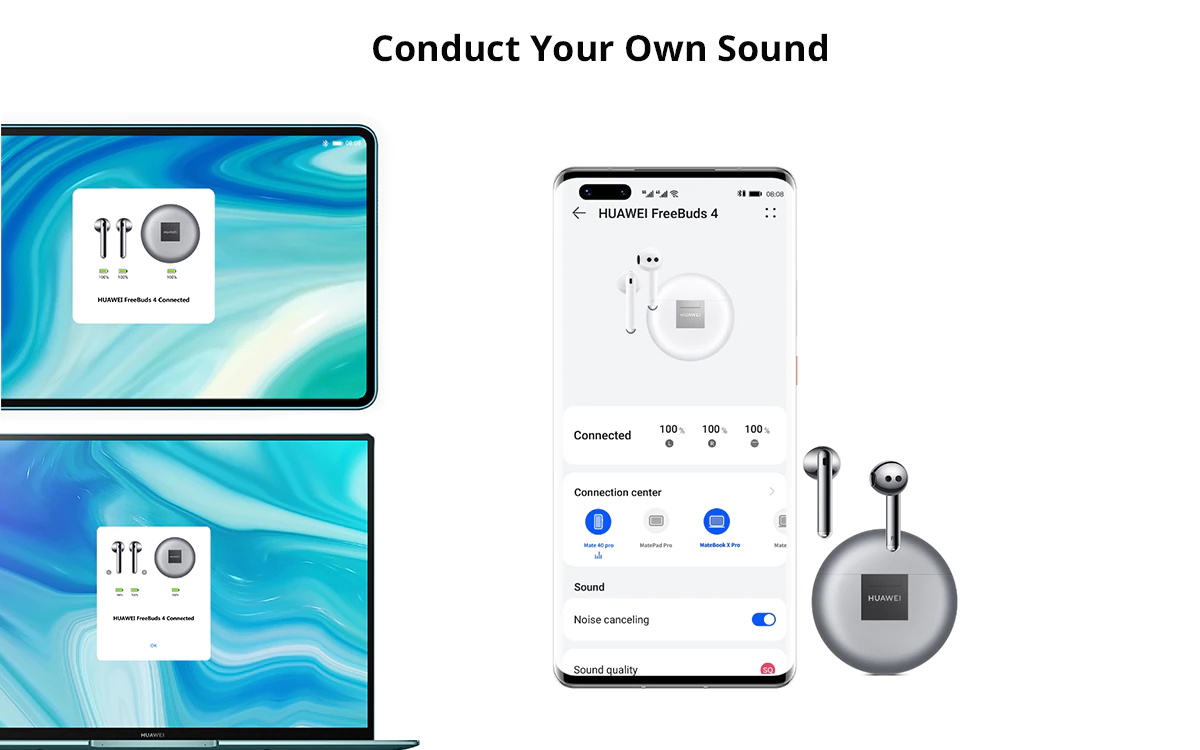 Die Audio Verbindung Center6 in die Huawei AI Leben App ermöglicht sie zu verwalten alle geräte gepaart zu HUAWEI FreeBuds 4 auf einem einzigen, einfach-zu-verwendung bildschirm. Verwenden die app zu übertragen audio zwischen geräten, und koordinieren ihre digitale leben auf die gehen.