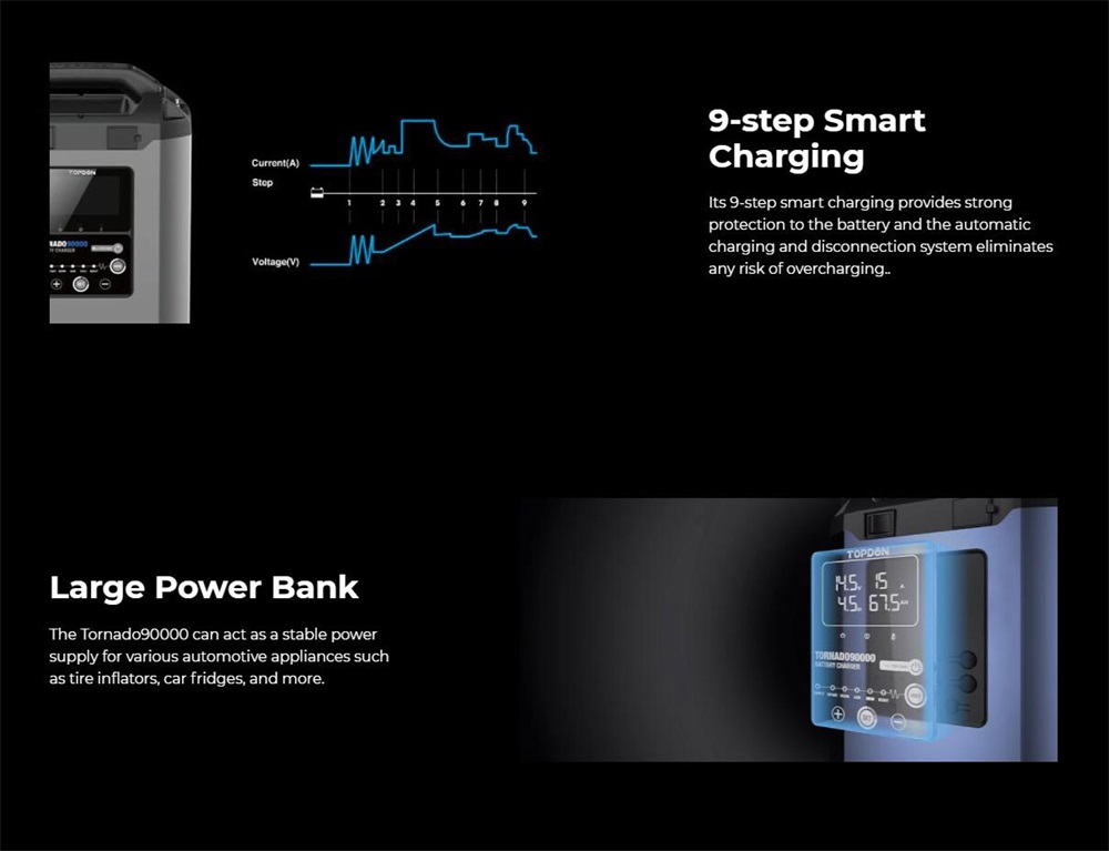 Sein „intelligentes Laden in 9 Schritten“ bietet starken Schutz für die Batterie und das automatische Lade- und Trennsystem eliminiert jedes Risiko einer Überladung.
