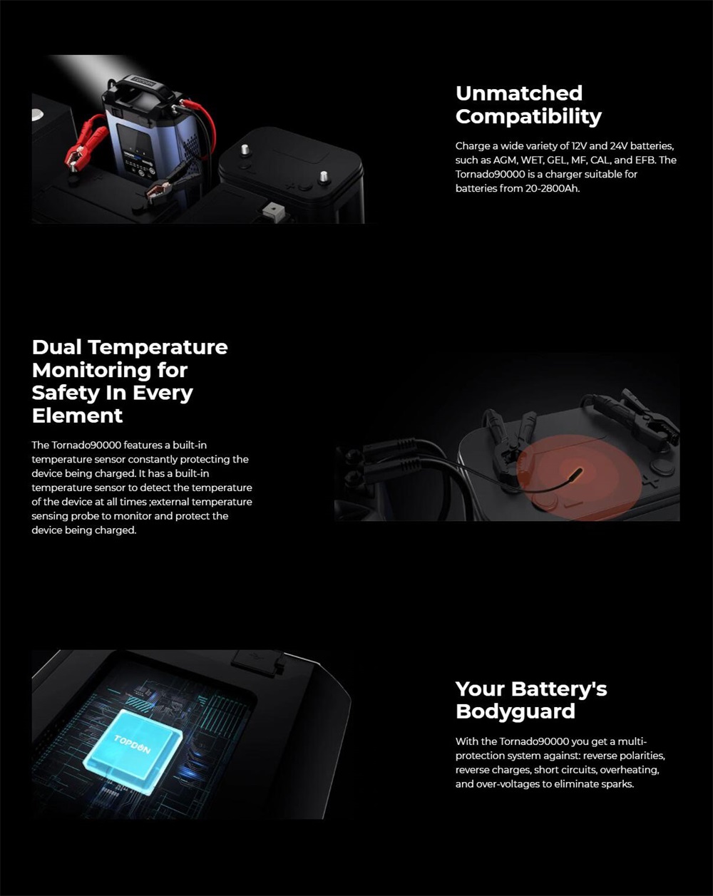 Mit dem T90A erhalten Sie ein Mehrfachschutzsystem gegen: Verpolung, Verpolung, Kurzschluss, Überhitzung und Überspannung .