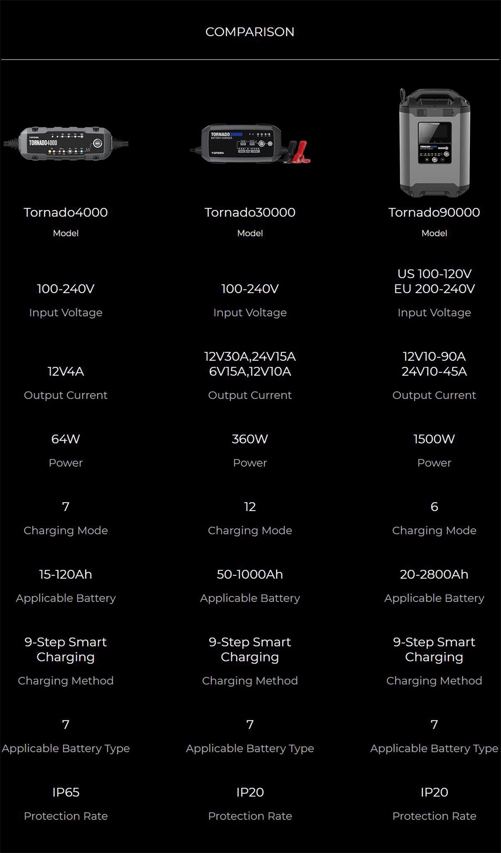 Der Tornado90000 bietet 6 programmierbare Lademodi, um jederzeit die richtige Strom- und Spannungsausgabe sicherzustellen. Dieses Gerät verfügt auch über eine Strombearbeitungs- und Spannungsbearbeitungsfunktion. Die Spannungseinstellung reicht von 11-15.8V und 22-31.6V. Entsprechende Ströme sind 5-90 A und 5-45 A