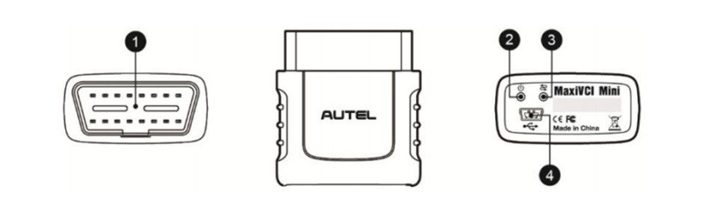 1. fahrzeug Daten Stecker (16-Pin) -verbindet die MaxiVCI Mini zu die fahrzeug der 16-pin DLC direkt.