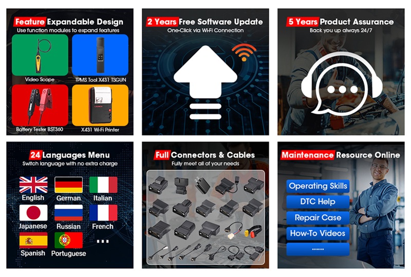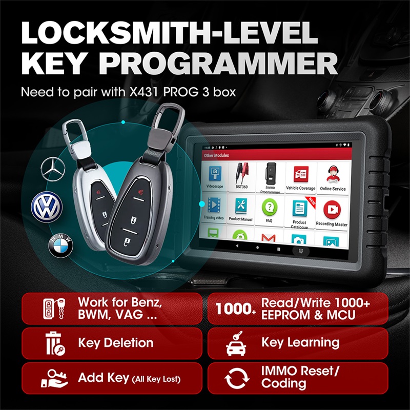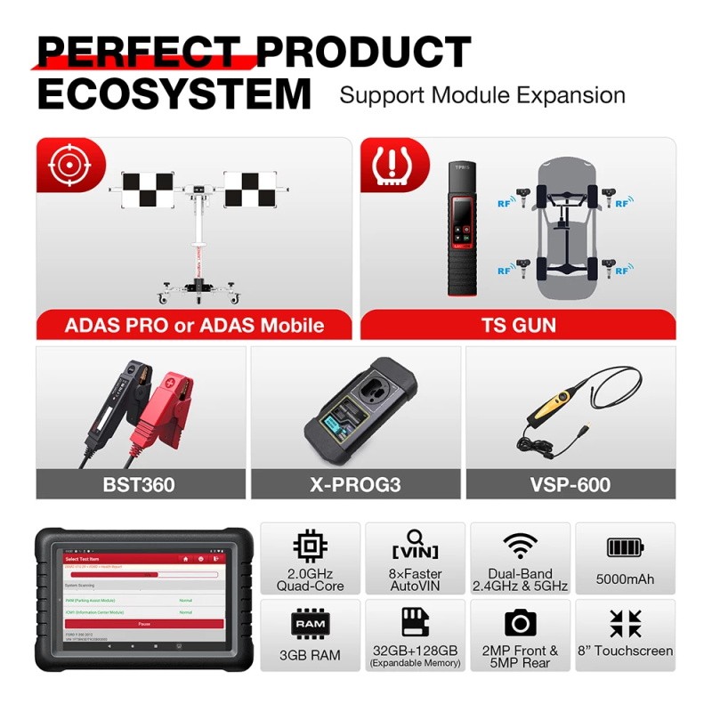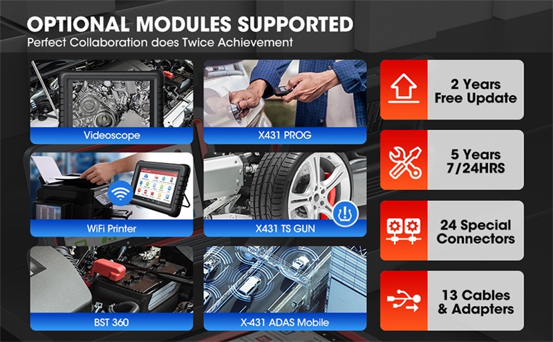 【Unterstützt WLAN-Drucker/Videoskop/TSGUN/X431 PRO G Optionale Funktionen】Videoskop: Überprüfen Sie unsichtbare Teile des Motors, des Kraftstofftanksystems usw.X431 TSGUN: Aktivieren Sie alle Sensoren, TPMS neu lernen, Programmieren Sie LAUNCH-SensorenX431 PROG: IMMO-Funktionen für VAG Group über 3.5X431 DRUCKER: Diagnosedaten/Berichte ausdrucken.