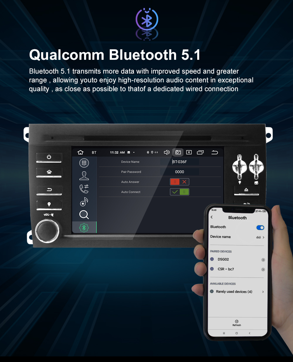 - BT-Einstellungen: Auto Antwort, Auto-Verbindung, Device Name