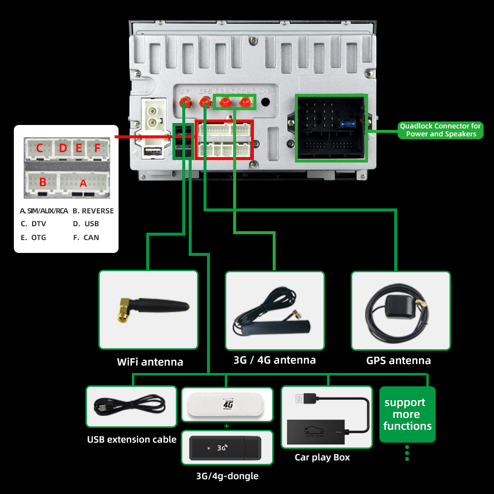 - Position: 3 USB auf dem Rücken, kann als Media/3G/4G/Kamera/DAB+/TPMS/Handy Anschluss