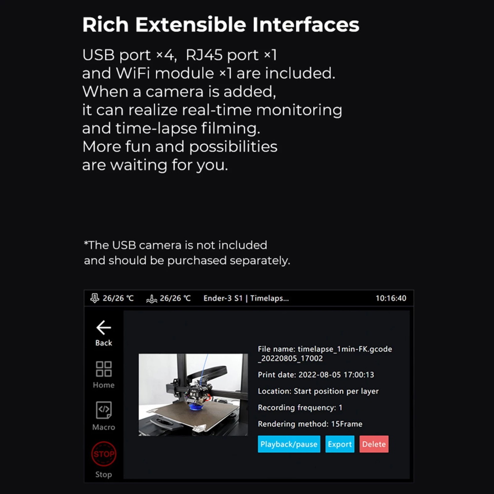 - Reichhaltige, erweiterbare Schnittstellen: USB-Anschluss x 4, ein RJ45-Anschluss und ein WiFi-Modul sind enthalten. Wenn eine Kamera hinzugefügt wird, kann sie Echtzeitüberwachung und Zeitrafferaufnahmen realisieren. Mehr Spaß und Möglichkeiten warten auf Sie.