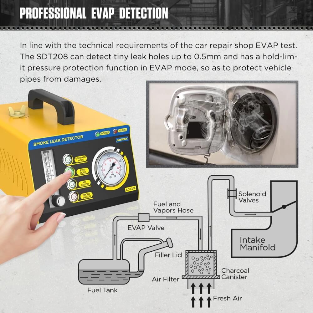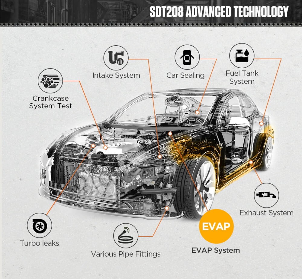 [Professional EVAP Erkennung]: In linie mit die technischen anforderungen der auto reparatur shop EVAP test. Die SDT208 können erkennen winzigen leck löcher bis zu 0,5mm und hat ein halten-grenze druck schutz funktion in