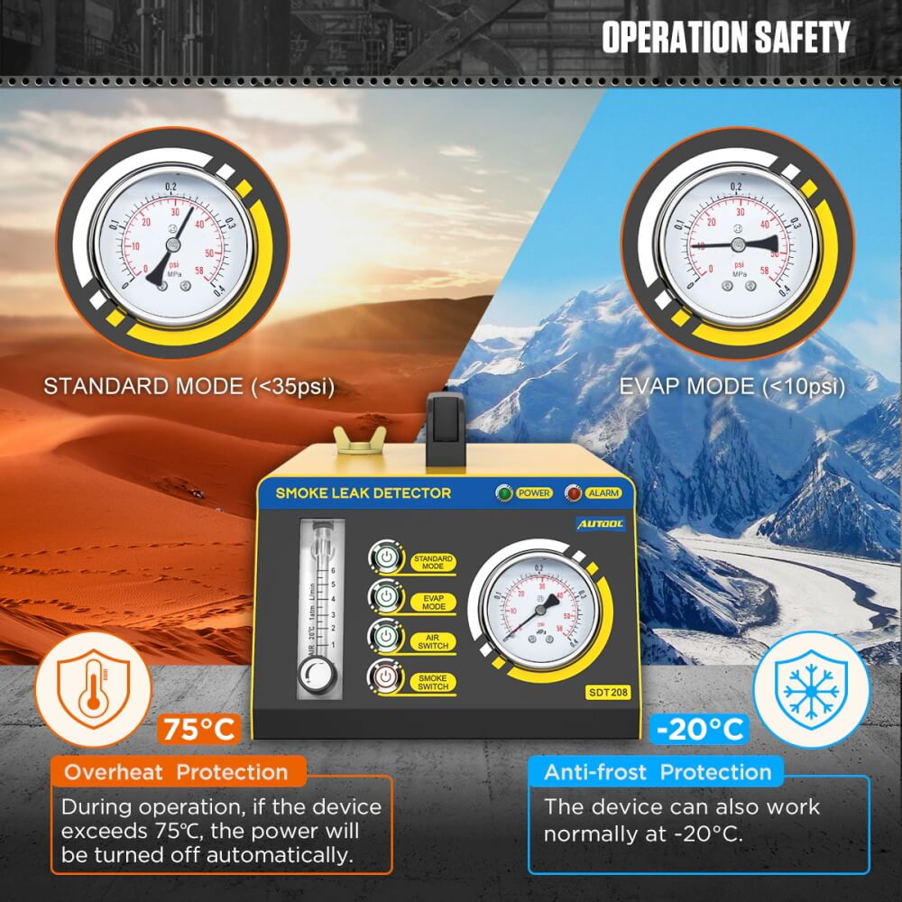 [Bedienung Sicherheit]: Die SDT208 besitzt hohe temperatur schutz und halten-grenze druck. Während des betriebs, wenn die ausrüstung sinne die temp. Über 75 °C, die netzteil wird automatisch power off. Wenn die luft druck übersteigt die Standard modus (35psi) /EVAP modus (10psi), die luft wird nicht mehr funktionieren. Diese effektiv sorgt für die sicherheit der betreiber und ausrüstung.
