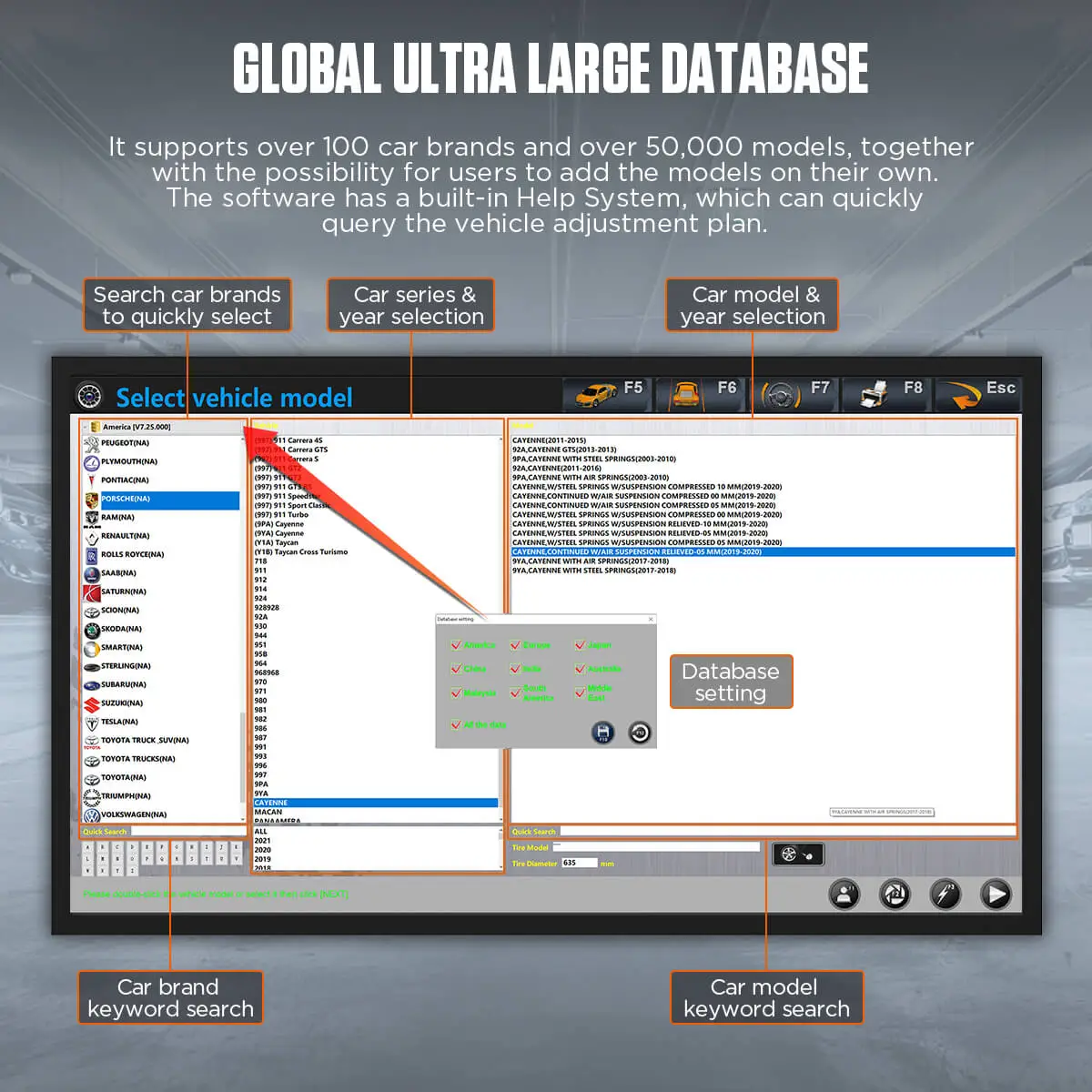 【 Weit verbreitet 】 Messsystem für die volle Fahrzeug karosserie Dimension, unterstützt diese Reifen maschine verschiedene Messungen einschl ießlich Toe-in, Sturz, Lenkachse Neigung, Nachlauf, Schub winkel, Spurbreite, Spurbreite diff, Radstand, und radstand diff. Es unterstützt über 100 Automarken und über 50.000 Modelle, zusammen mit der Möglichkeit für Benutzer, die Modelle selbst hinzuzufügen. Die Software verfügt über ein eingebautes Hilfesystem, das den Fahrzeug anpassungs plan schnell abfragen kann.