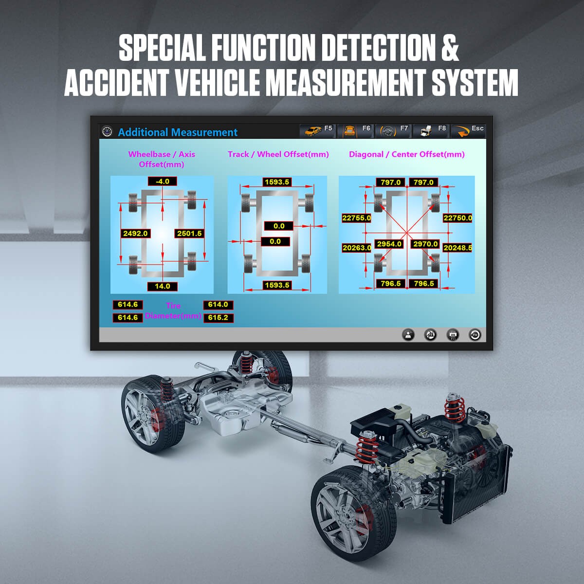 【 Kurze Entfernung der rollenden Auslauf kompensation 】 Das Fahrzeug auf eine kurze Entfernung von 8-12cm (3,2-4,7 Zoll) nach hinten schieben kann Messdaten sammeln, die Reifen im Bereich von 13-23 Zoll erkennen können. Offset-Kompensation wird durch Walzen durchgeführt, die kein Anhalten erfordert und einen kurzen und einstellbaren Rollweg hat. Darüber hinaus ist der Rad ausrichter mit einem speziellen Funktions erkennungs-und Unfall fahrzeug messsystem ausgestattet.
