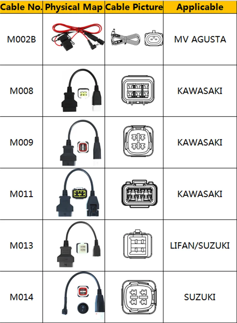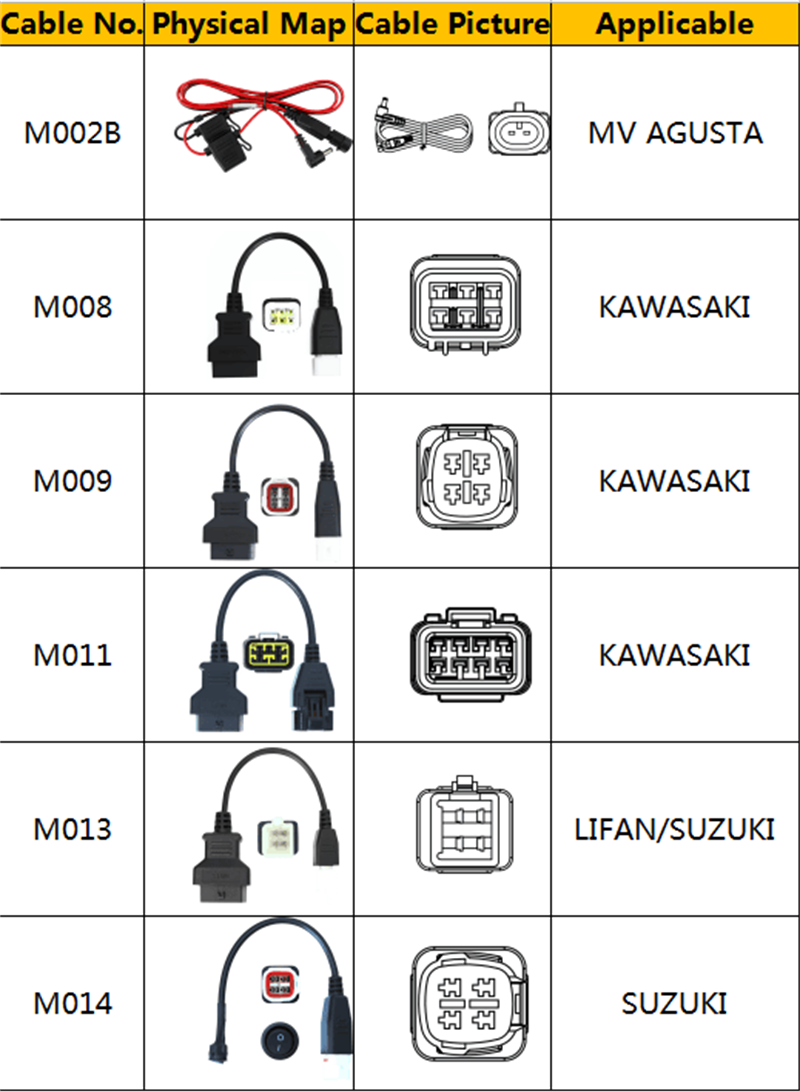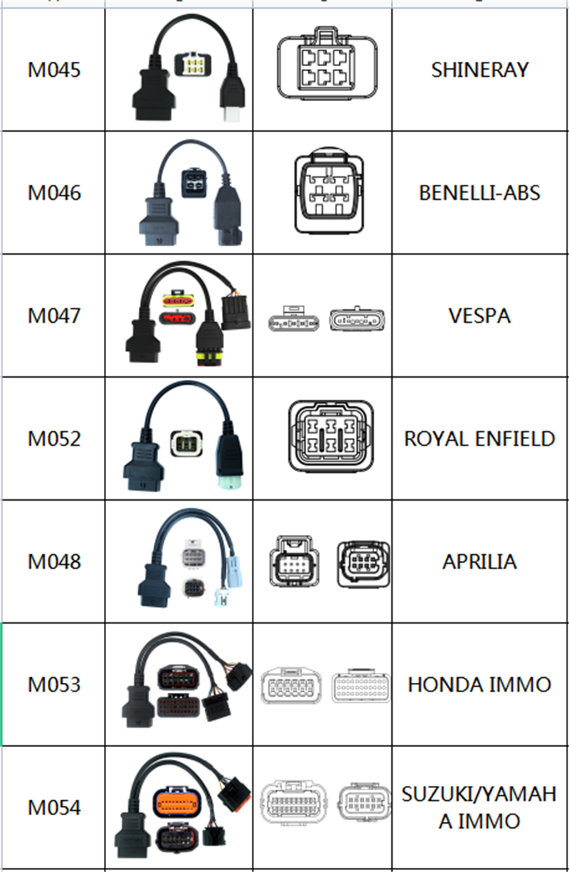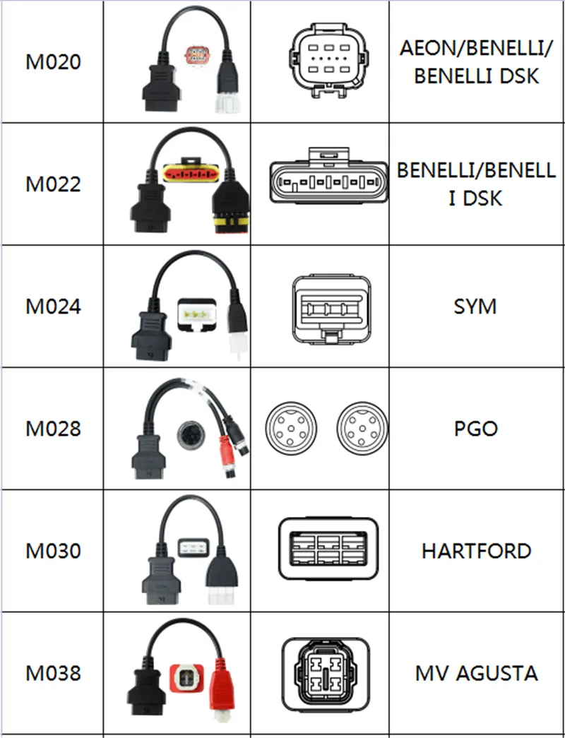 Dies ist ein komplettes Kit optionaler Adapter für OBDSTAR MS80, kompatibel mit MV AGUSTA,KAWASAKI, LIFAN/SUZUKI, AEON/BENELLI/BENELLI DSK,BENELLI/BENELLI DSK, SYM, PGO, HARTFORD, SHINERAY, BENELLI-ABS, VESPA and ROYAL ENFIELD.