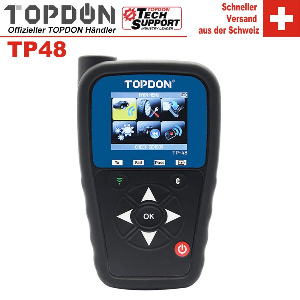 Mit dem TOPDON TP48 RDKS Diagnosetool können Sie alle wichtigen OEM RDKS Sensoren aktivieren, lesen, diagnostizieren und warten. Dieses Tool erweitert die robusten Funktionen des TP47, indem es neue Softwarefunktionen wie OBDII-Fähigkeiten, OBDII-Neulernverfahren und Sync ID bietet. Zu den weiteren Software-Funktionen gehören die Möglichkeit der Steuergeräte-Entriegelung und Plakettenanpassung sowie die neue Programmierfunktion, mit der der Benutzer Fahrzeug-IDs aus dem Steuergerät abrufen kann. Die breitere Kompatibilität des TP48 wird Ihren Arbeitsprozess reibungsloser gestalten, da Sie alle Ihre Kunden mit nur einem Gerät bedienen können. Mit diesem Produkt erhalten Techniker die zuverlässigen Daten, die sie benötigen, um ihre Kunden besser bedienen zu können, z. B. Sensor-IDs, Druck, Temperatur, Batteriestatus und mehr.