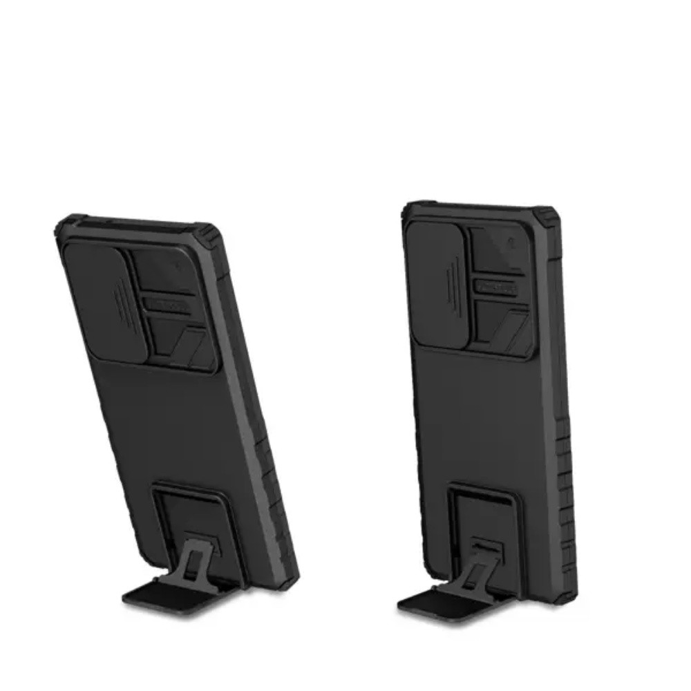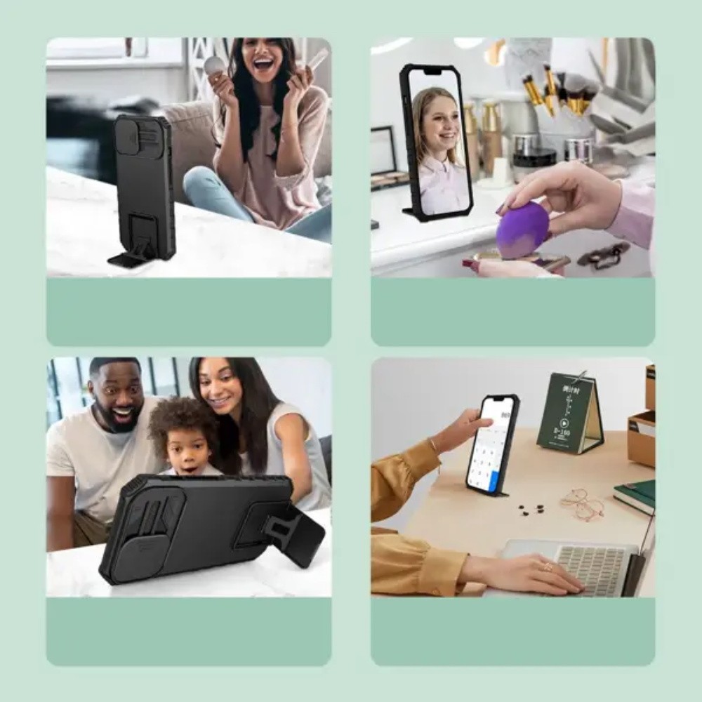 Auch die Rückkamera ist durch den Cam-Slider-Kameraschutz optimal geschützt. In die Hülle ist außerdem ein ausklappbarer Ständer integriert, ideal zum Ansehen von Filmen, Videoclips oder Bildern im Quer-/Hochformat.