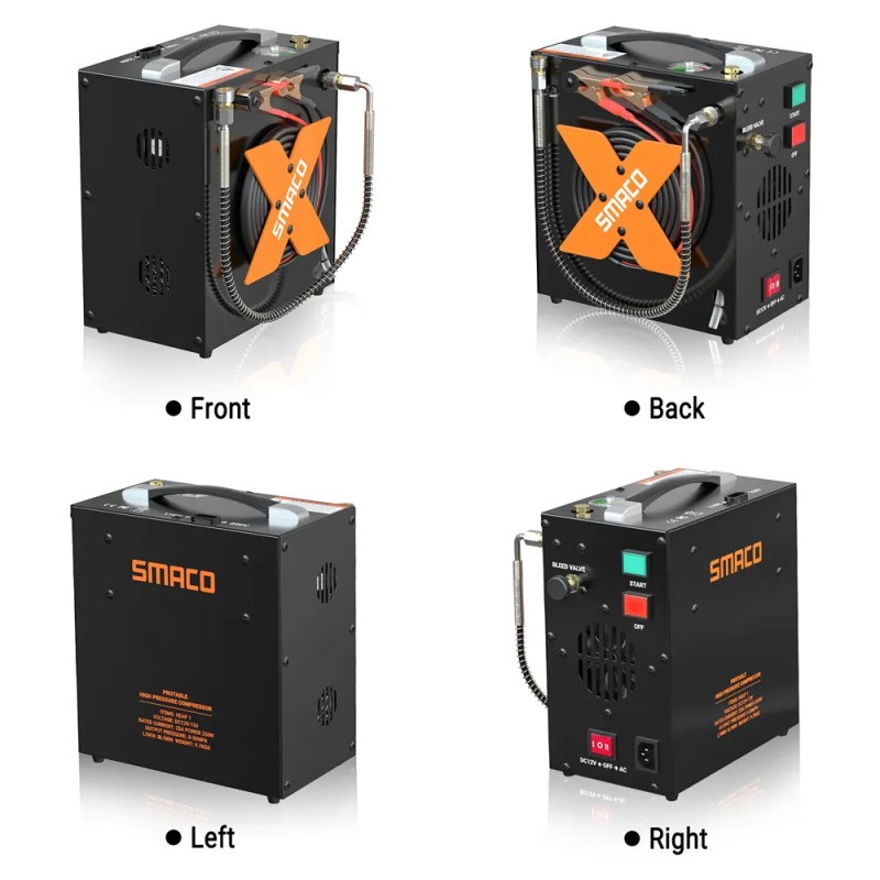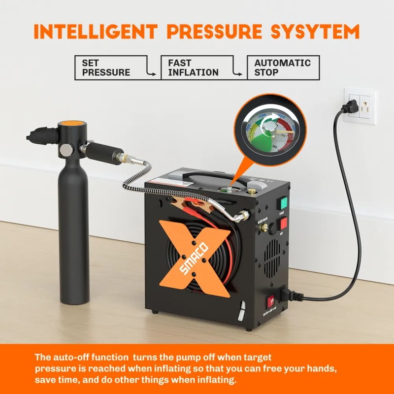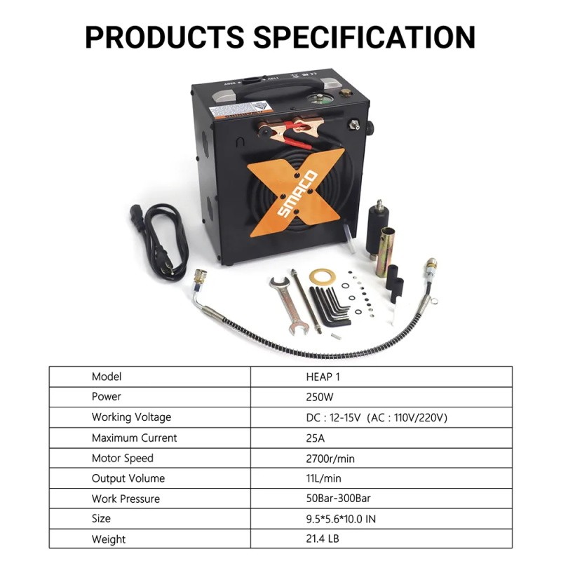 Dieser tragbare Luftkompressor ist hauptsächlich für PCP-Luftgewehre, Paintball-Waffen und Tauchflaschen konzipiert. Füllen Sie unter Arbeitsspannung einen 0,5-Liter-Tank von 0 psi auf 3000 psi in 11 Minuten; das Befüllen eines 1-Liter-Tanks von 0 psi auf 3000 psi dauert 26 Minuten; Das Befüllen eines 2-Liter-Tanks von 0 psi auf 3000 psi dauert 46 Minuten (10 Minuten Kühlung pro 25 Minuten Betrieb).