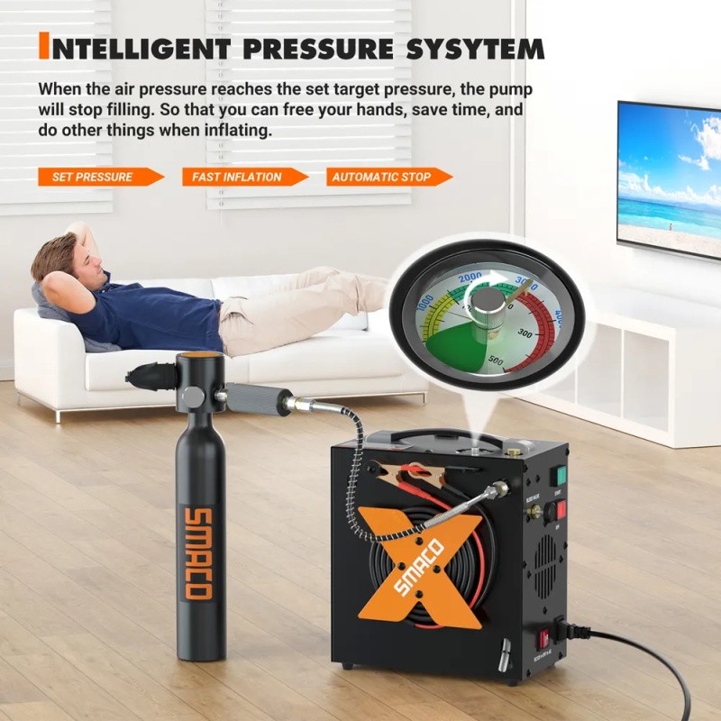 Der PCP-Luftkompressor wiegt nur 21.4 LB und hat eine Größe von 9.5 * 5.6 * 10 Zoll. Er ist einfach zu bedienen und sehr bequem zu Hause zu verwenden oder mit nach draußen zu nehmen. Dies ist ein sehr leiser Luftkompressor, das Geräusch ist sehr gering, Sie können sogar normal mit Ihren Freunden kommunizieren, während er arbeitet.