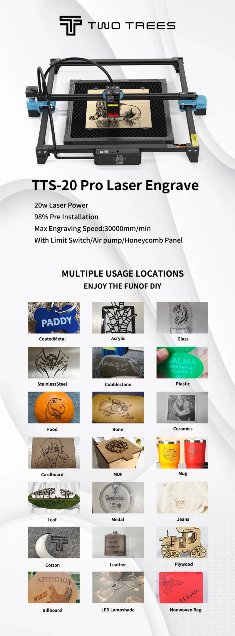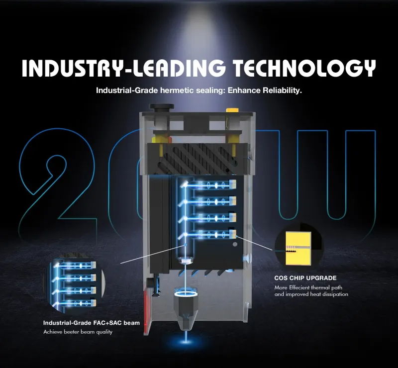 Ausgestattet mit einem aktualisierten COS-Chip, hat es eine leistungsstarke Laserleistung von 20W, die die Graviergeschwindigkeit bis zu 500mm/s machen kann, und die maximale Verarbeitungsgeschwindigkeit kann 30000mm/min erreichen. Die Graviergeschwindigkeit wurde um 100% erhöht.