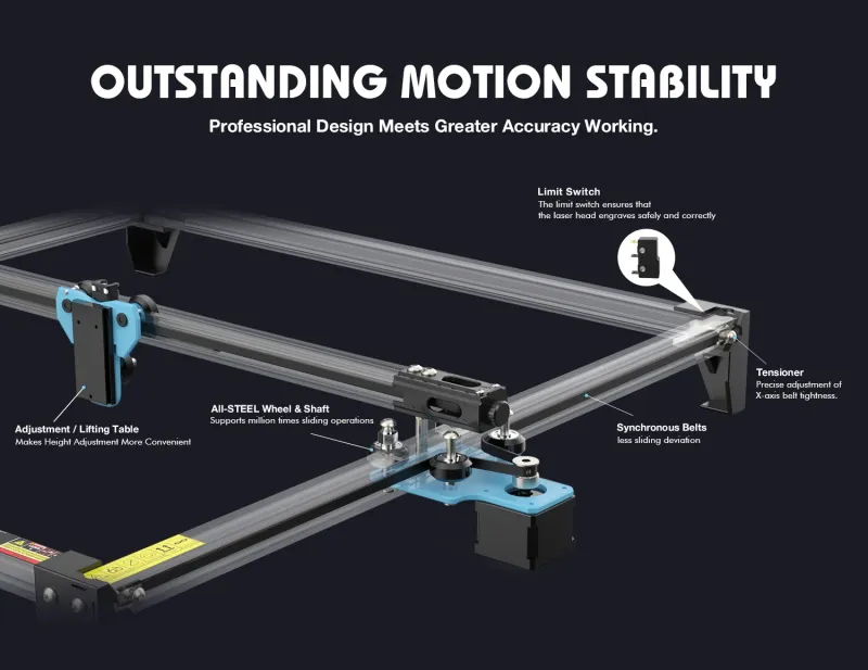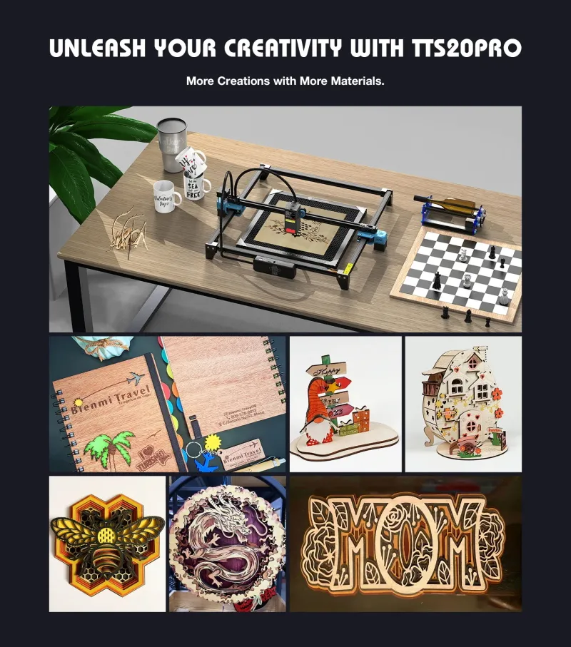 Der TTS-20 Pro Laserkopf verwendet die 0,08mm komprimierte Spot-Technologie, um Ihre Holzschnitzerei deutlicher zu machen. Die Vorrichtung zur Einstellung der Riemenspannung und das Design der Stahlachse gewährleisten eine hohe Bewegungsgenauigkeit von 0,01 mm und eine Wiederholpositionierungsgenauigkeit von 0,02 mm. Mit diesen Gravierwerkzeugen können Sie Ihre Gravurvorlagen schnell und gut fertigstellen.