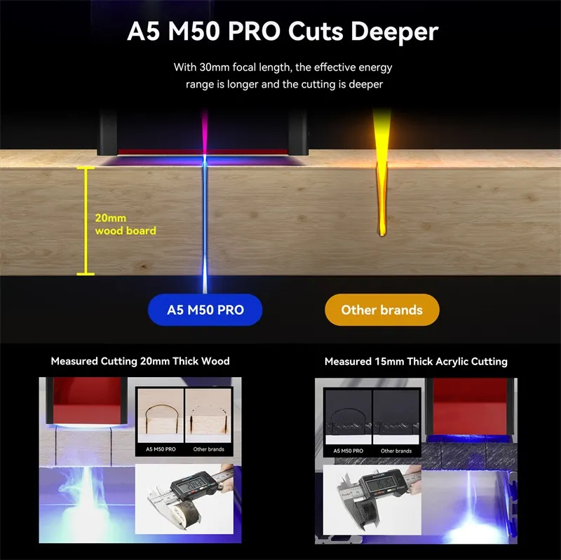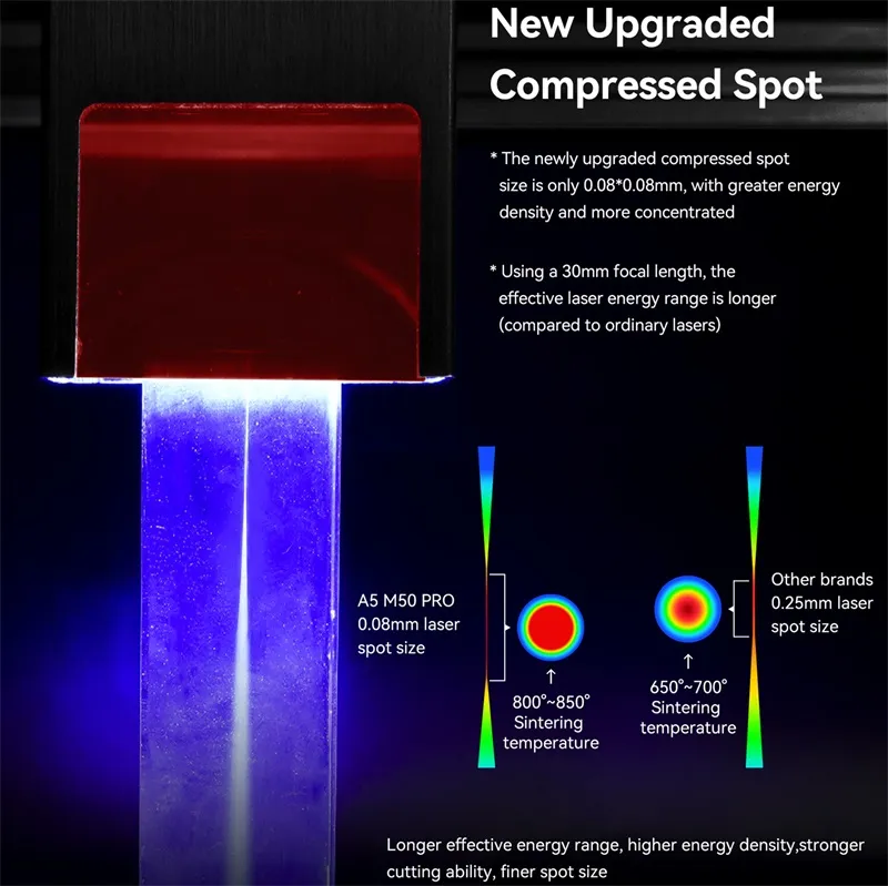Verbesserte Hochleistungs-Laser mit festem Fokus: Keine Notwendigkeit, den Fokus vor der Gravur und stabiler als der Zoom-Laser zu justieren; der neue Laser-Brennpunkt ist 50% kleiner als andere gewöhnliche Laser, neue laser kombinieren präzision gravur und hohe energie schneiden zur gleichen zeit.