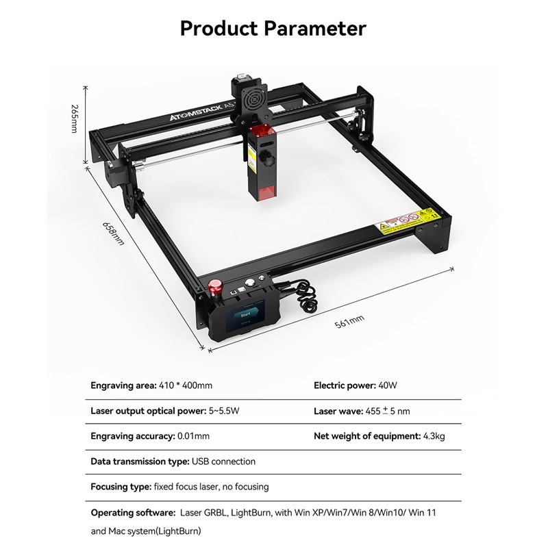 Spezifikation: Artikel modell: ATOMSTACK A5 M50 PRO Gravur bereich: 410*400mm Schnitz materialien: Holz, Bambus, Pappe, Kunststoff, Leder, MDF, Schiefer, lackiertes Metall, Spiegel Edelstahl; Schneid material: Pappe, Vliesstoff, Furnier, Acryl, etwas dünnes Plastik brett, Schwamm, MDF, Leder; Laser leistung: 40w Laser ausgangs leistung: 5-5.5 w Wellenlänge: 445 ± 5nm Gravur genauigkeit: 0,01mm Fokussierung methode: örtlich festgelegter Fokus laser, keine Notwendigkeit, sich zu konzentrieren Lasers chutz abdeckung: Schützen Sie die Augen des Benutzers und verhindern Sie, dass Haustiere den Laser fleck greifen. Betriebs software: laser grbl, light burn, unterstützung win xp/win 7/win 8/xp/win 10 system. Eingabe format: nc, bmp, jpg, png, dxf, etc. Daten übertragungs methode: USB-Verbindung. Eingangs spannung: AC 240-V, 50/60Hz Ausgangs spannung: dc12v, 5a Zertifizierung: ce fcc rohs fda Ausrüstung Nettogewicht: 4.3 kg Geräte größe: 570*600*270mm Verpackungs größe: 590*345*130mm/23.2*13.6*5.1 Zoll Paket gewicht: 5980g/13.1 lb