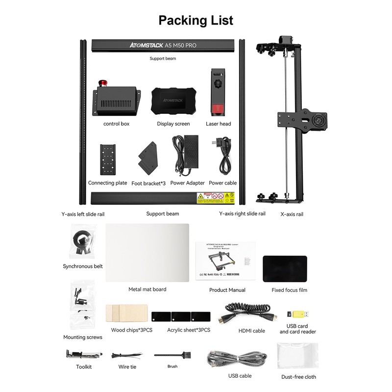 Verpackungs liste: 1 x Befestigungs schraube 1 x Werkzeugs atz 4 x Fuß polsters chaum 1 x Film 3 x Acryl platte 3 x Holzspäne 10 x Kabelbinder 1 x Trocken mittel 1 x Pinsel 1 x sauberes Tuch 1 x Kartenleser 1 x tf-Karte 1 x Netzteil 1 x Anweisung 1 x Datenleitung 1 x Touchscreen-Komponenten 1 x Kabel 1 × Laser modul 1 × Schneid kissen 1 × x Achsen baugruppe 1 × y Achse linkes Profil 1 × y Achse rechtes Profil 1 × Profil auf der Basis 1 × unter dem Basis profil 3 × Fuß halterung