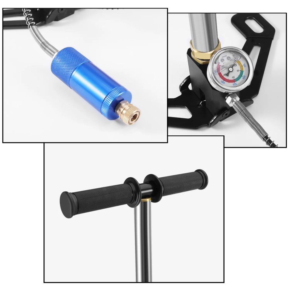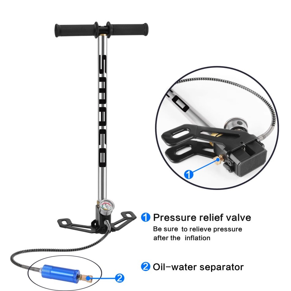 Die Smaco Hochdruck-Handpumpe ist mit einem Luftfilter ausgestattet, der überschüssiges Öl in der Füllluft entfernt, und einem Hochdruckschlauch, der eine stabile Position beim Pumpen garantiert. Ein an der Unterseite der Pumpe installiertes Manometer zeigt den Innendruck an und auf der anderen Seite befindet sich das Überdruckventil, das den Innendruck am Ende des Ladevorgangs ablässt.