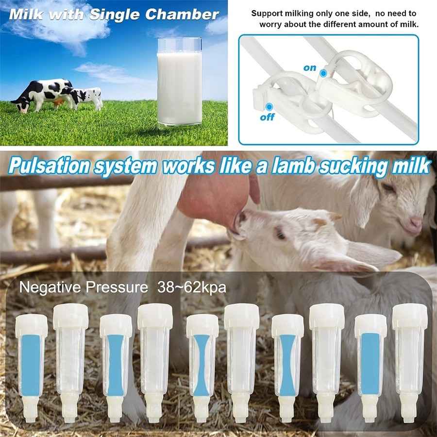 Das Vakuumpulsierungssystem führt dazu, dass das Brustwarzenfutter auf und unter der Brustwarze etwa einmal jede Sekunde zusammenfällt, um die Brustwarze zu massieren und einen normalen Blutfluss zu erhalten. Es wird Schäden oder Verletzungen der Brustwarzen durch kontinuierliches Vakuum verhindern. Diese pulsierende Melkmaschine für Ziegen/Kuh simuliert die Stärke und Frequenz der menschlichen Hände gut und gibt Ihrem Schaf / Kuh ein komfortableres Melkerlebnis.