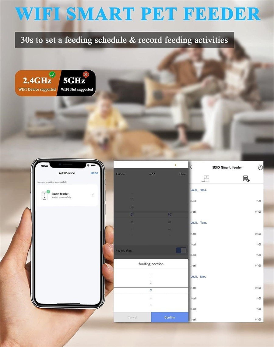 Der Katzen futterautomaten verbindet sich schnell und stabil mit dem 2.4GHz WiFi über Bluetooth-Zulassung. Es dauert nur 30 Sekunden, um einen Fütterungsplan in der App festzulegen, was viel einfacher ist als die Verwendung des Tastenmodells. Sie können Ihre Haustiere jederzeit und überall auf Ihrem Smartphone füttern und das Fütterungsprotokoll in der App anzeigen, um sicherzustellen, dass der katzenfutter automat wie geplant funktioniert.