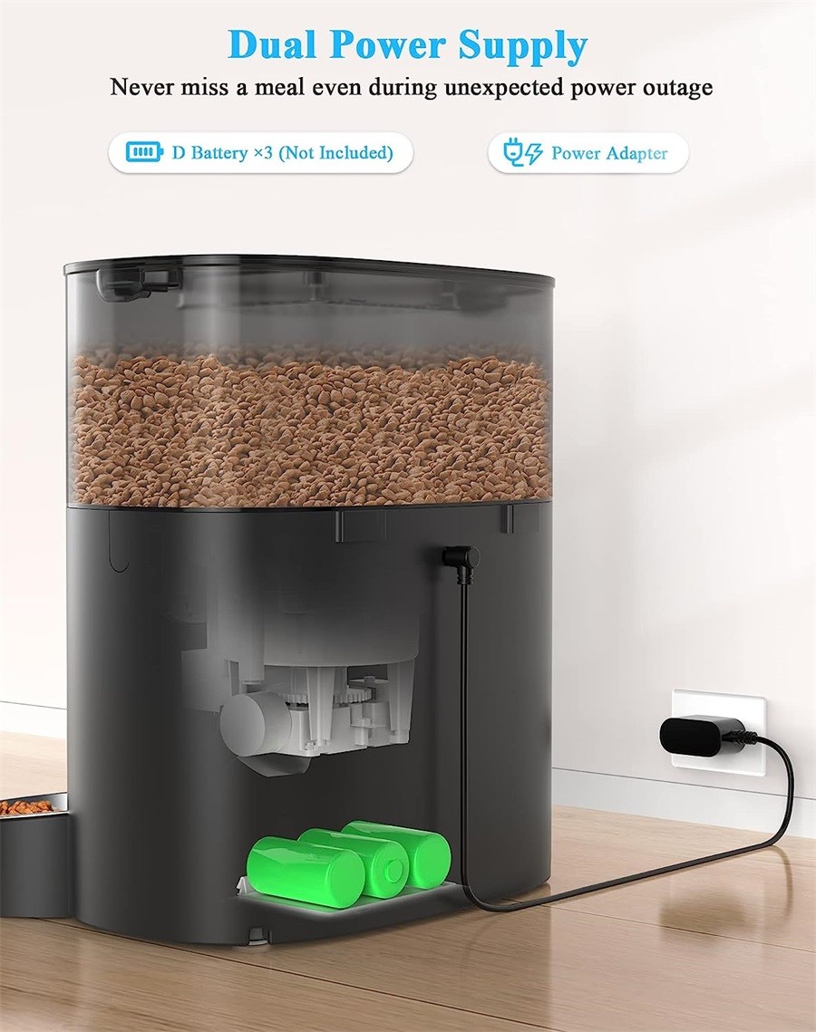 Der katzenfutterautomat trockenfutter kann mit einem Gleichstromadapter und 3 Alkaline-Batterien der Größe D (Batterie NICHT im Lieferumfang enthalten) betrieben werden. Wir empfehlen, sowohl Akku als auch Adapter zu verwenden. Im Falle eines Stromausfalls läuft der Futterautomat mit 3 Batterien der Größe D weiter, um sicherzustellen, dass Ihre Haustiere keine Mahlzeit verpassen.