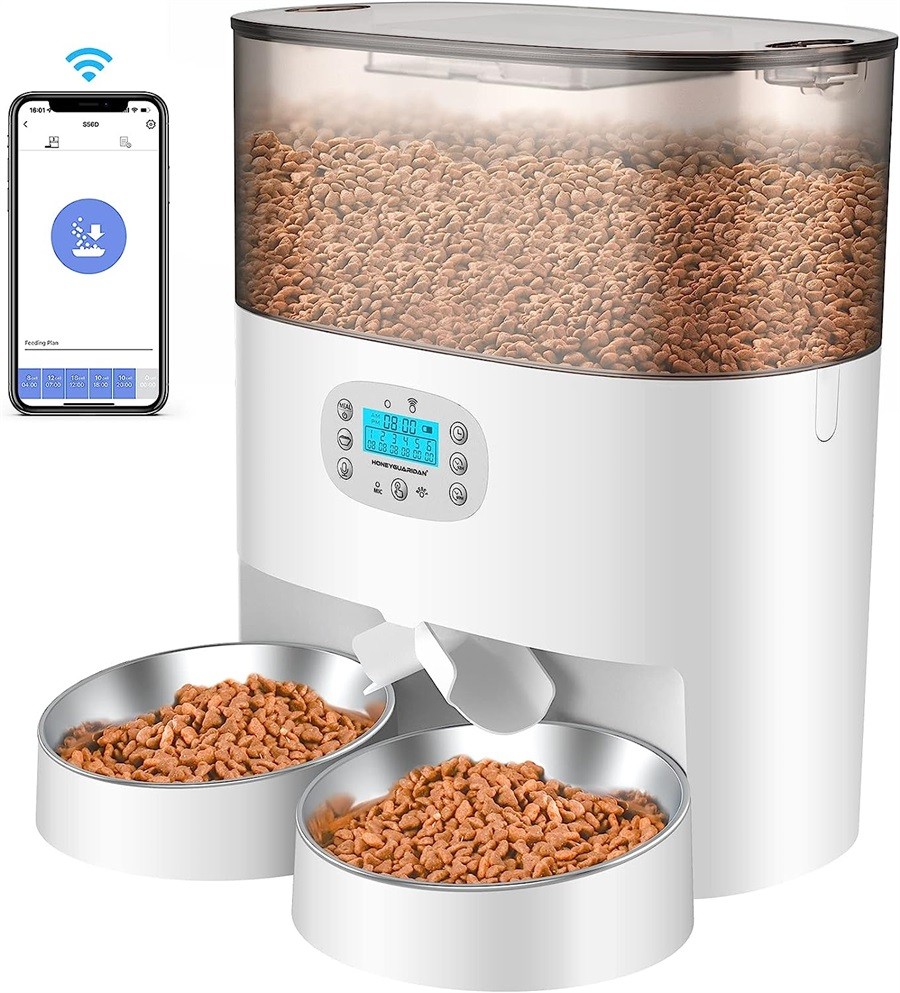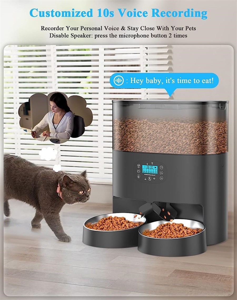 Sie können 1-6 Mahlzeiten pro Tag und bis zu 24 Portionen Trockenfutter pro Mahlzeit zu festgelegten Zeiten einstellen. 1 Portion entspricht etwa 6 g (variiert je nach Krokettengröße). Der cat feeder automatic kann 2,2 kg Trockenfutter lagern, wobei der Zwei-Wege-Futterspender die Mahlzeiten gleichmäßig halbiert. Sie können 2 Katzen gleichzeitig zum Preis von einem Gerät füttern. Der katze futterautomat kann zwischen 1 und 2 Schalen wechseln.