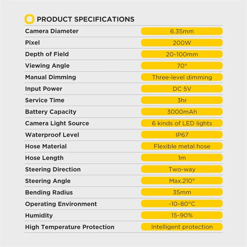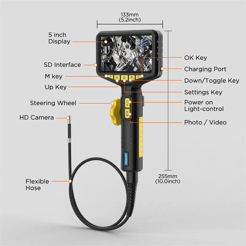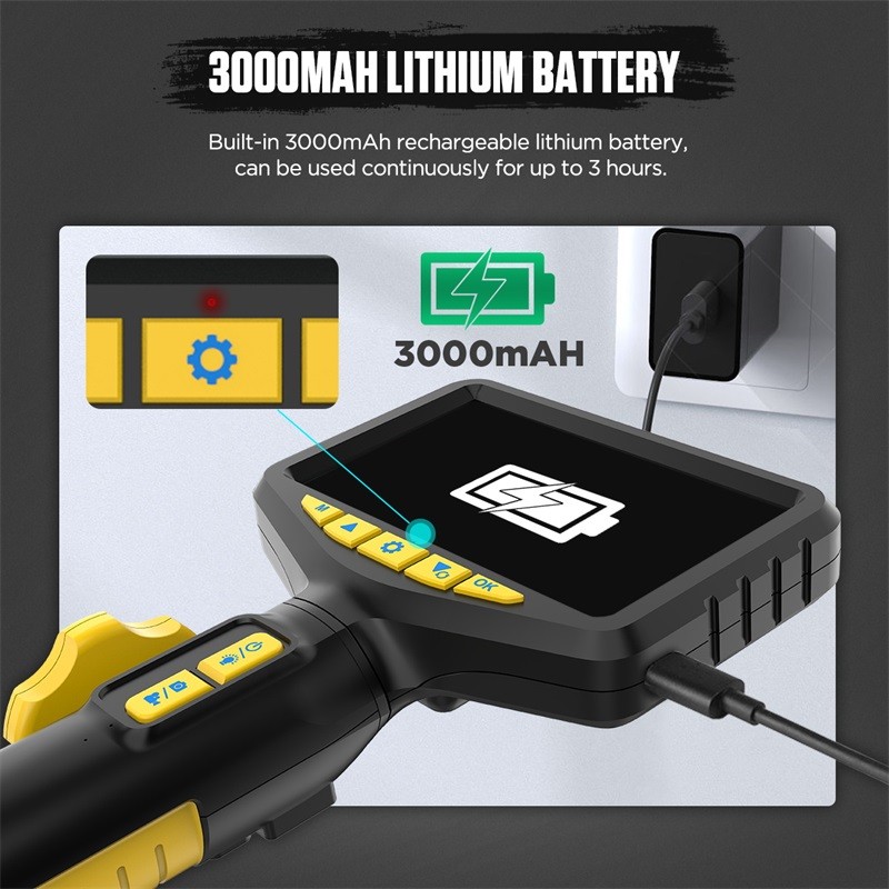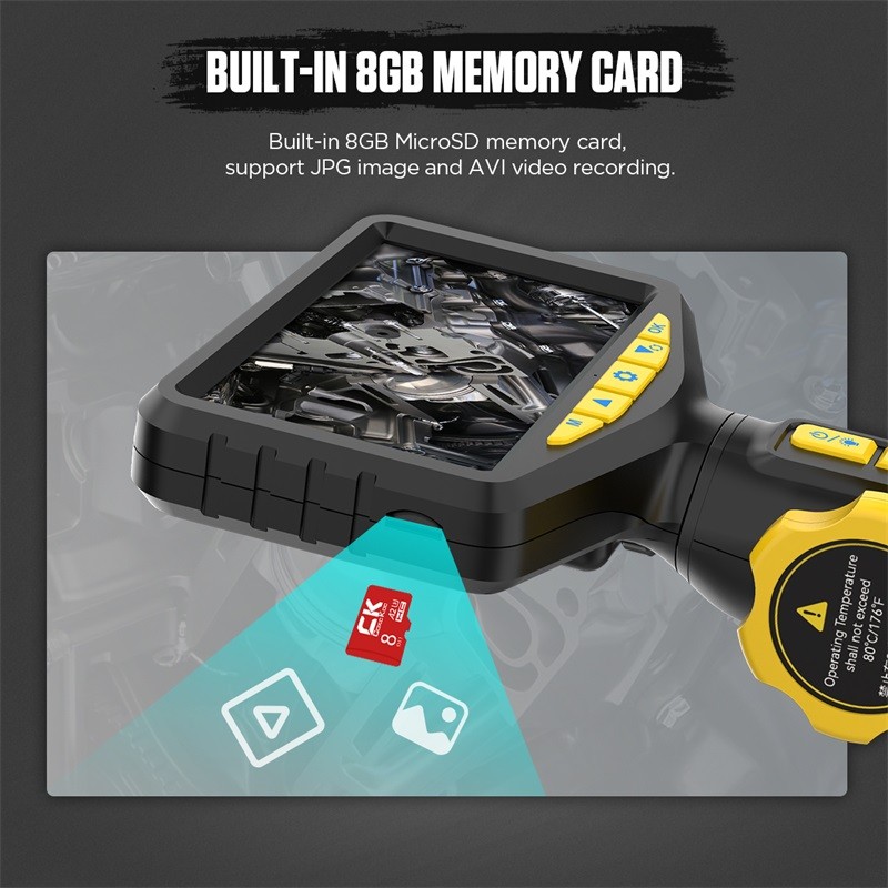 -Das Produkt hat eine Lenk erkennungs funktion und hat eine einzigartige Hochtemperatur-Alarm funktion, die es für Benutzer bequem macht, die kleine Sonde in den engen Raum zu durchdringen, und übertragen Sie dann das vivid, klare und omni direktion ale Video und Bilder auf das 5-Zoll-Display, um Ihre verschiedenen Erkennungs bedürfnisse zu erfüllen.
