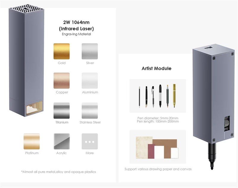 Der LX1 Max ist mit vier austauschbaren Modulen konfigurierbar; ein 20W 450nm Blaulichtlaser, ein 1064nm Wellenlänge Infrarotlaser und ein Künstlermodul kompatibel mit verschiedenen Stiften und Zeichengeräten. Diese Werkzeuge realisieren die Möglichkeit mit verschiedenen Materialien, Oberflächen und Projekten zu arbeiten.
