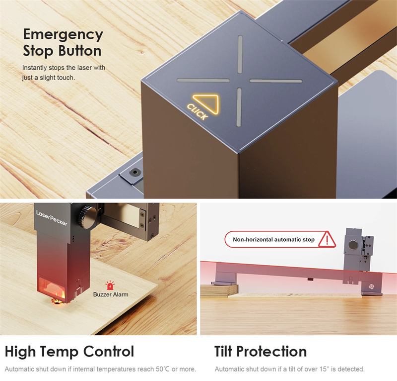LX1 Max verfügt über verschiedene Schutzmaßnahmen: Der Not-Aus-Knopf kann den Laser mit einer leichten Berührung sofort stoppen; Der Laser schaltet sich automatisch ab, wenn die Innentemperatur über 50 °C liegt. Wenn die Neigung über 15 ° liegt, startet der Laser den Neigungsschutz und schaltet den Laser aus.