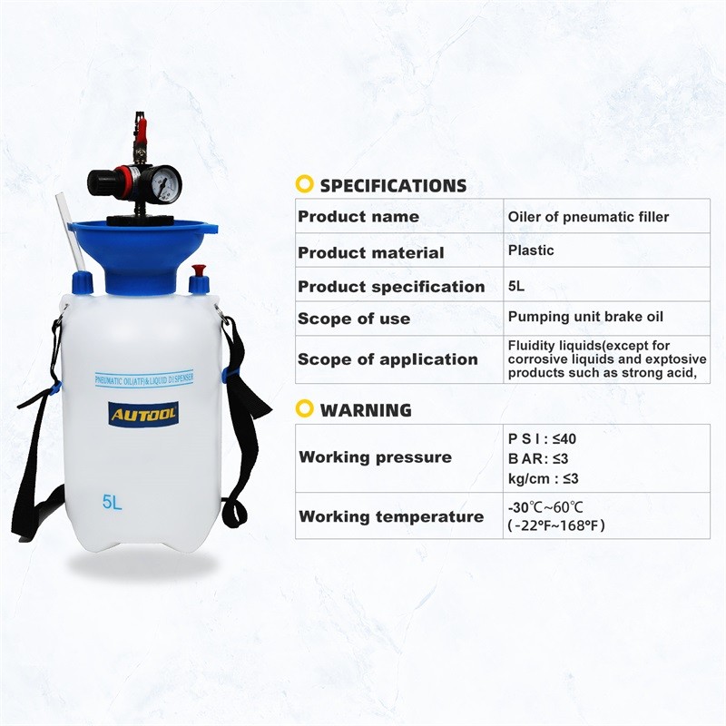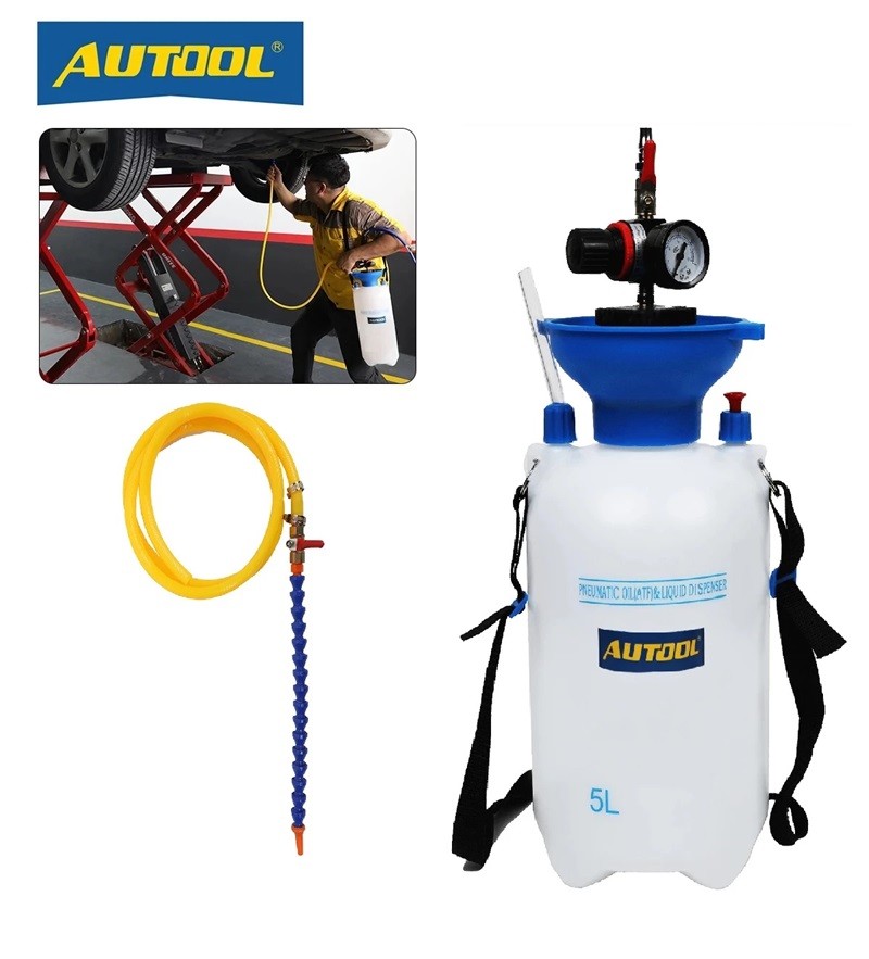 AUTOOL 5L Öl Flüssigkeit Füllung Ausrüstung Kit Öl Flüssigkeit Dunst Füllung Spritze Flasche Transfer für Auto Lkw & ManometerMarkenname: AUTOOLUrsprung: CN (Herkunft)Modellnummer: 5L Pneumatische ATF Betankungsmaschine