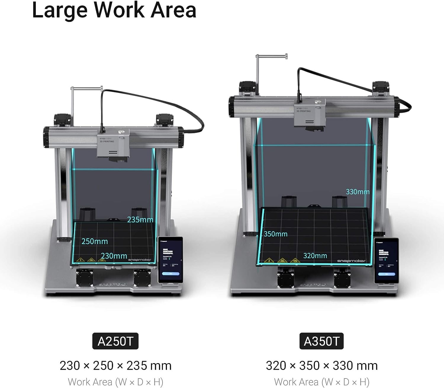 Snapmaker A350T bietet ein großes Bauvolumen von 320 x 350 x 330 mm, so dass Sie A350T verwenden können, um Modelle zu drucken, die 95% anderer Drucker nicht können, und Sie können einteilige große Prototypen drucken, ohne die Datei in kleinere aufteilen zu müssen. Es verkürzt die Zeit, die von einer Idee zur Realität benötigt wird.