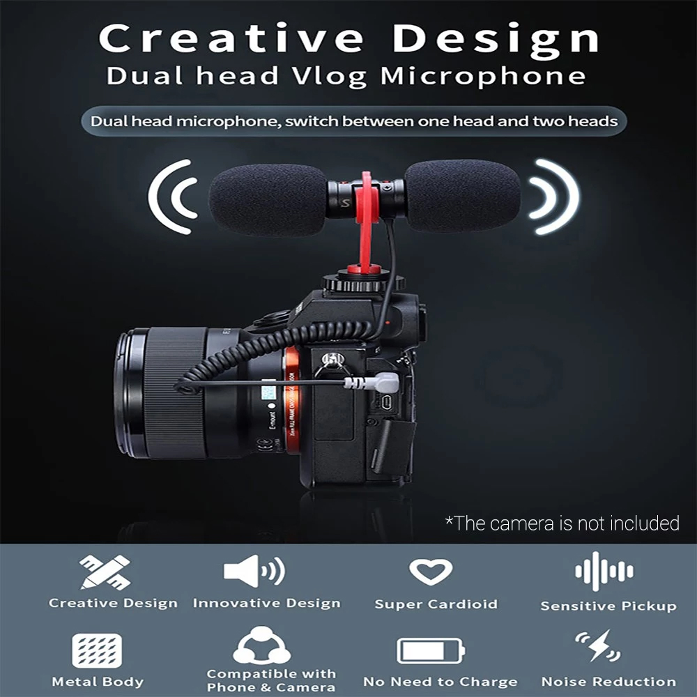 Doppelkopf-Mini-Vlog-Mikrofon, kann frei zwischen einem Kopf und zwei Köpfen wechseln, innovatives patentiertes Design.