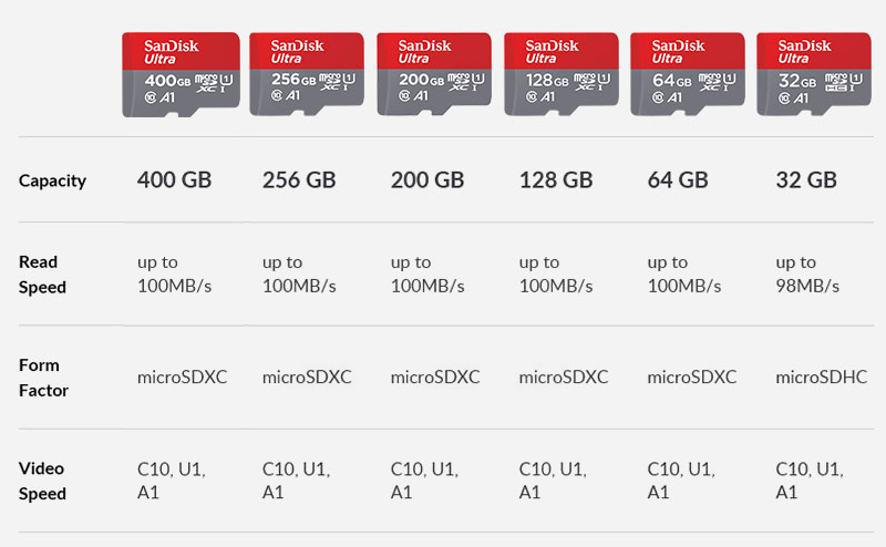 64 GB /128GB /200GB / 256GB ----- MicroSDXC, Klasse 10, A1, maximale Lesegeschwindigkeit bis 100 MB/s;