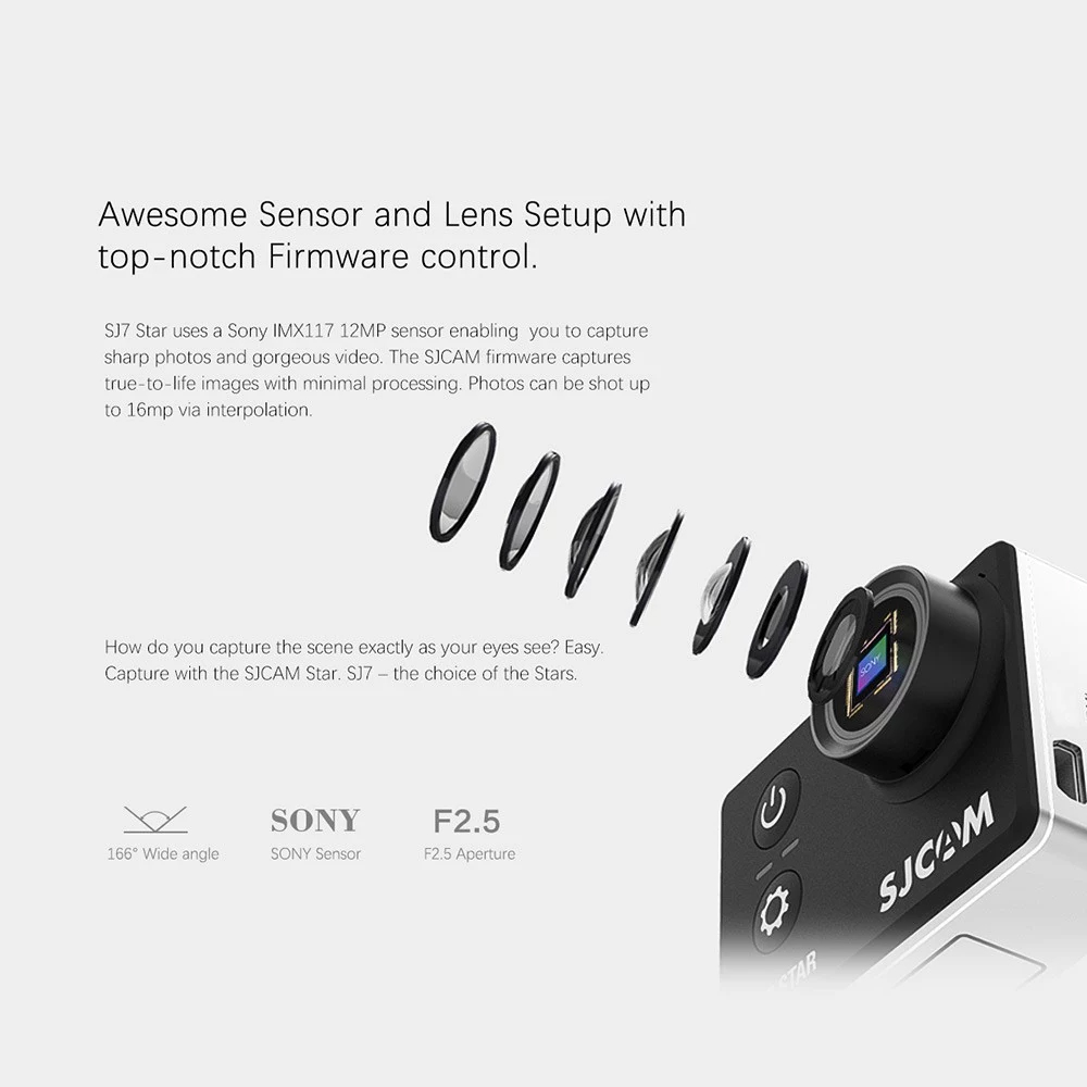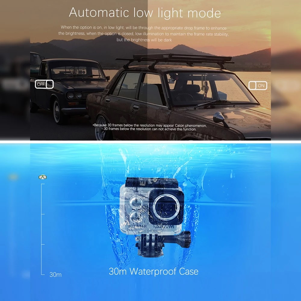 4K Sport Kamera, ausgestattet mit AMBARELLA A12S75 Chipsatz und IMX117 Sensor, 2.0 "Sensitive Touchscreen bietet eine bessere Bedienung Erfahrung für die Endverbraucher, Sport-Videokamera kann bei 1080P 4K aufgenommen werden: 3840 × 2160 16: 9 30fps (Native 4K)., 960P und 720 P. Einzelne Bilder sind 12 MP und werden auf 16 MP interpoliert.