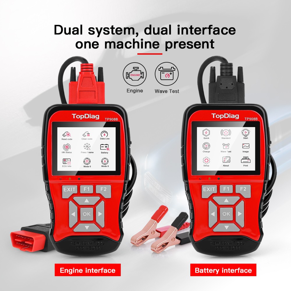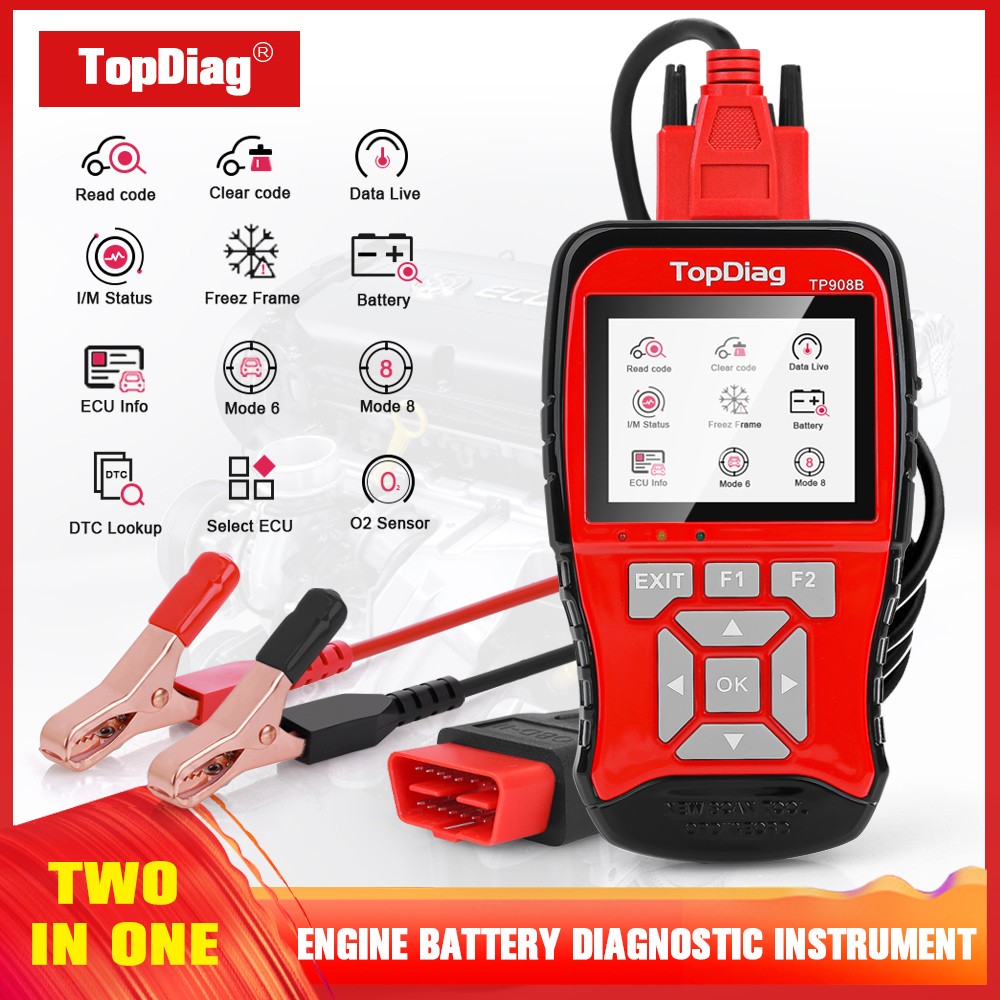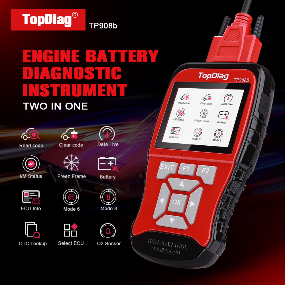 TopDiag Top908B diagnose instrument + batterie tester 2 in 1 1.TP908B OBDII / EOBD auto diagnose instrument ist entwickelt, um unterstützung OBDII / EOBD motor emission verwandte diagnose 2,12 V batterie intelligente analyzer, alle funktionen von batterie test, starten test und lade test.