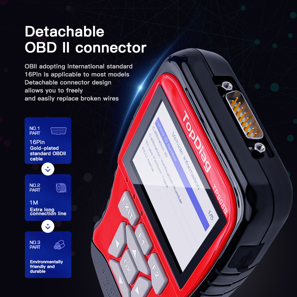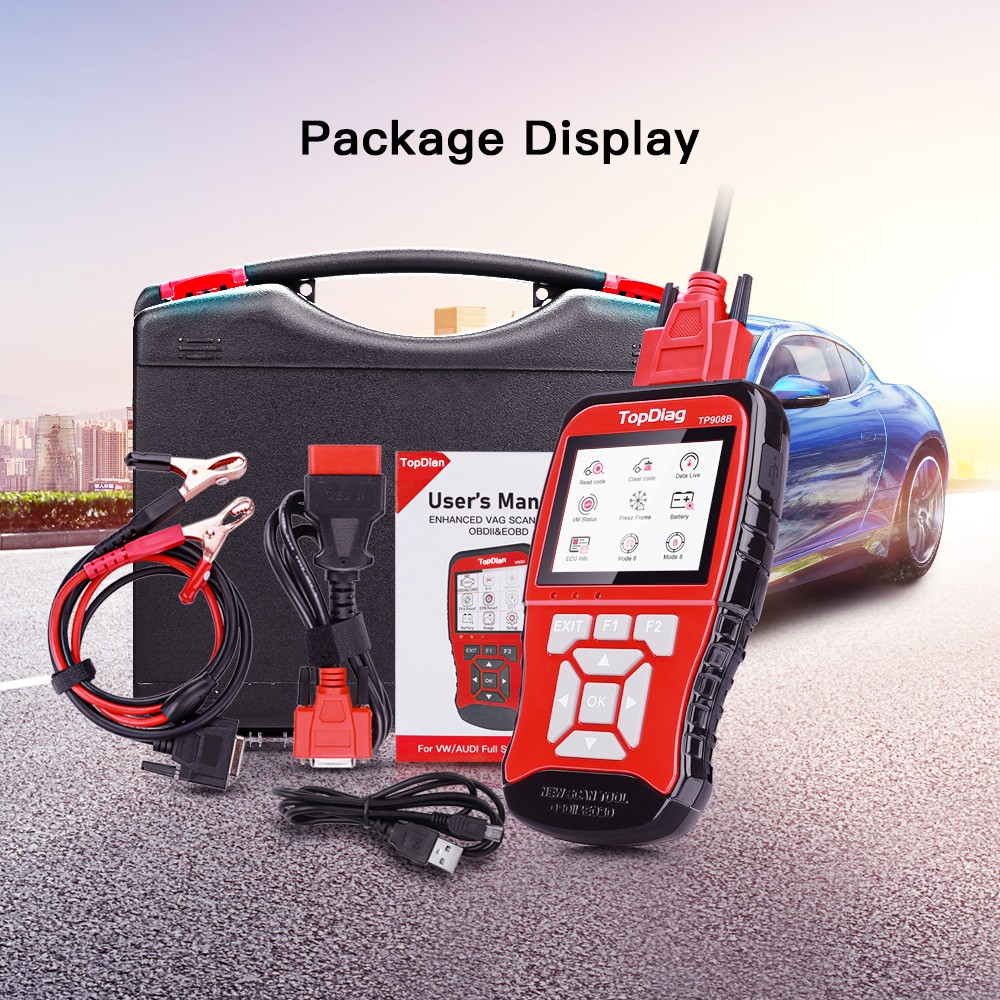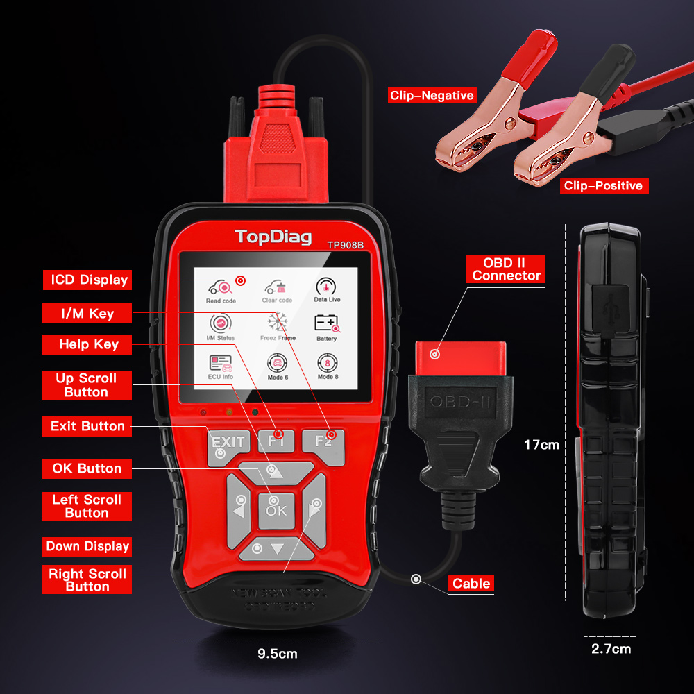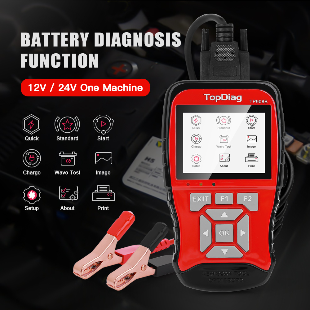 TopDiag Top908B diagnose instrument + batterie tester 2 in 1 1.TP908B OBDII / EOBD auto diagnose instrument ist entwickelt, um unterstützung OBDII / EOBD motor emission verwandte diagnose 2,12 V batterie intelligente analyzer, alle funktionen von batterie test, starten test und lade test.