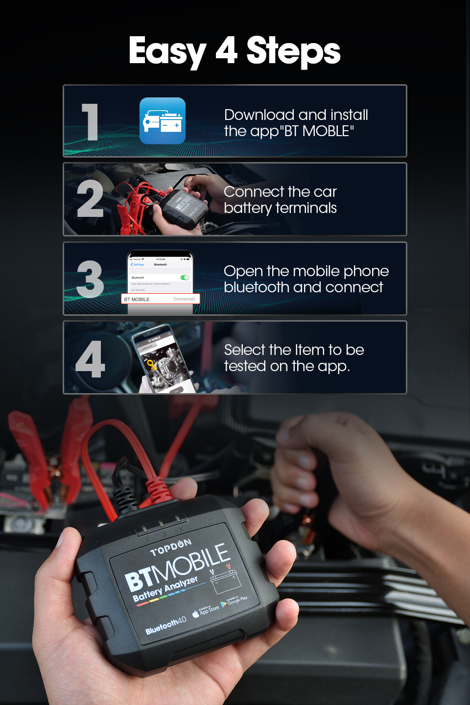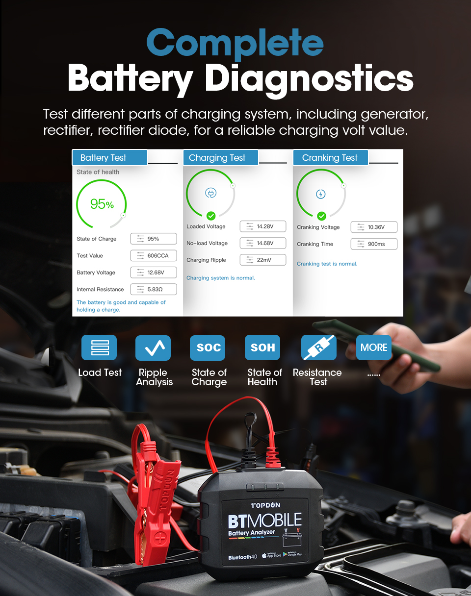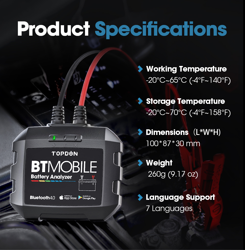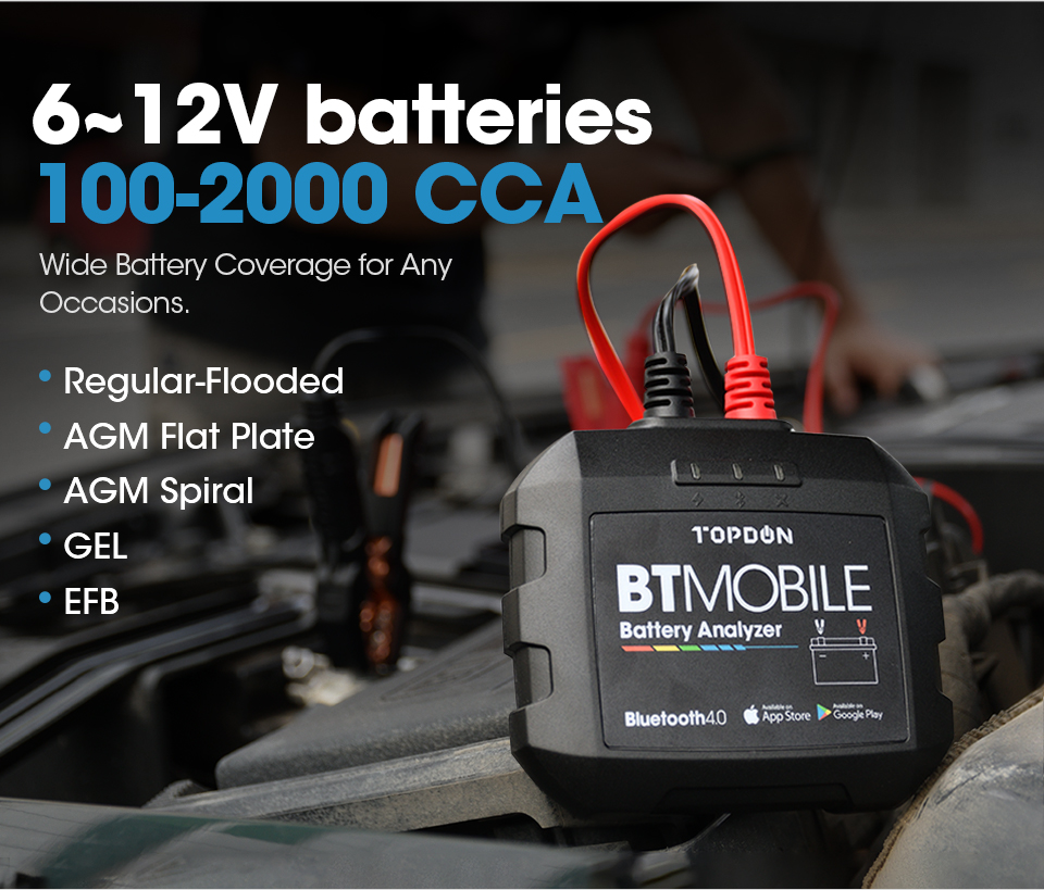 Einfach download und installieren die TOPDON BTMobile App von Apple-Store / Google Spielen zu smartphones oder tabletten (iOS 8,0 & Android 4.3, oder oben), und sync BTMobile Batterie Tester, zu erfahrung die meisten erweiterte tests technologie für 6 ~ 12V blei-säure batterien (100-2000 CCA) einschließlich regelmäßige überflutet, AGM flache platte, AGM spirale, GEL und EFB; abdeckt 10 großen bewertung standards: CCA, BCI, CA, MCA, JIS, DIN, IEC, EN, SAE, GB.