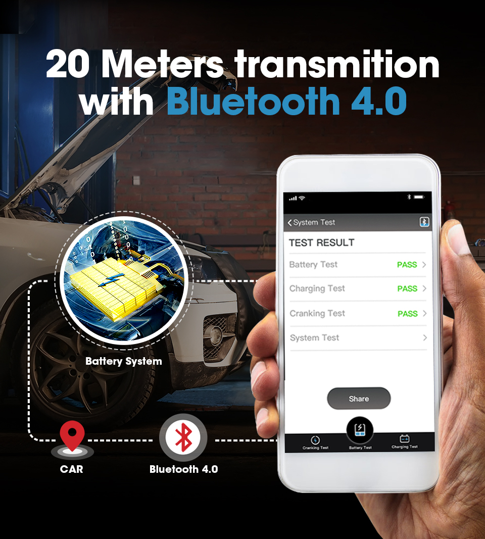 Verweilen in der ganzen arbeitsbereich mit diesem wireless batterie tester zu haben eine gesamt analyse von batterien gesundheit, über seine präzise und schnelle Batterie Test, Ankurbeln Spannung Test, Lade System Test, ohne zu verlieren eine verbindung. Geeignet für die überprüfung batterien in motor fahrzeuge, licht lkw, Wohnmobile, boote, SUVs, ATVs und sogar gesetz traktoren.