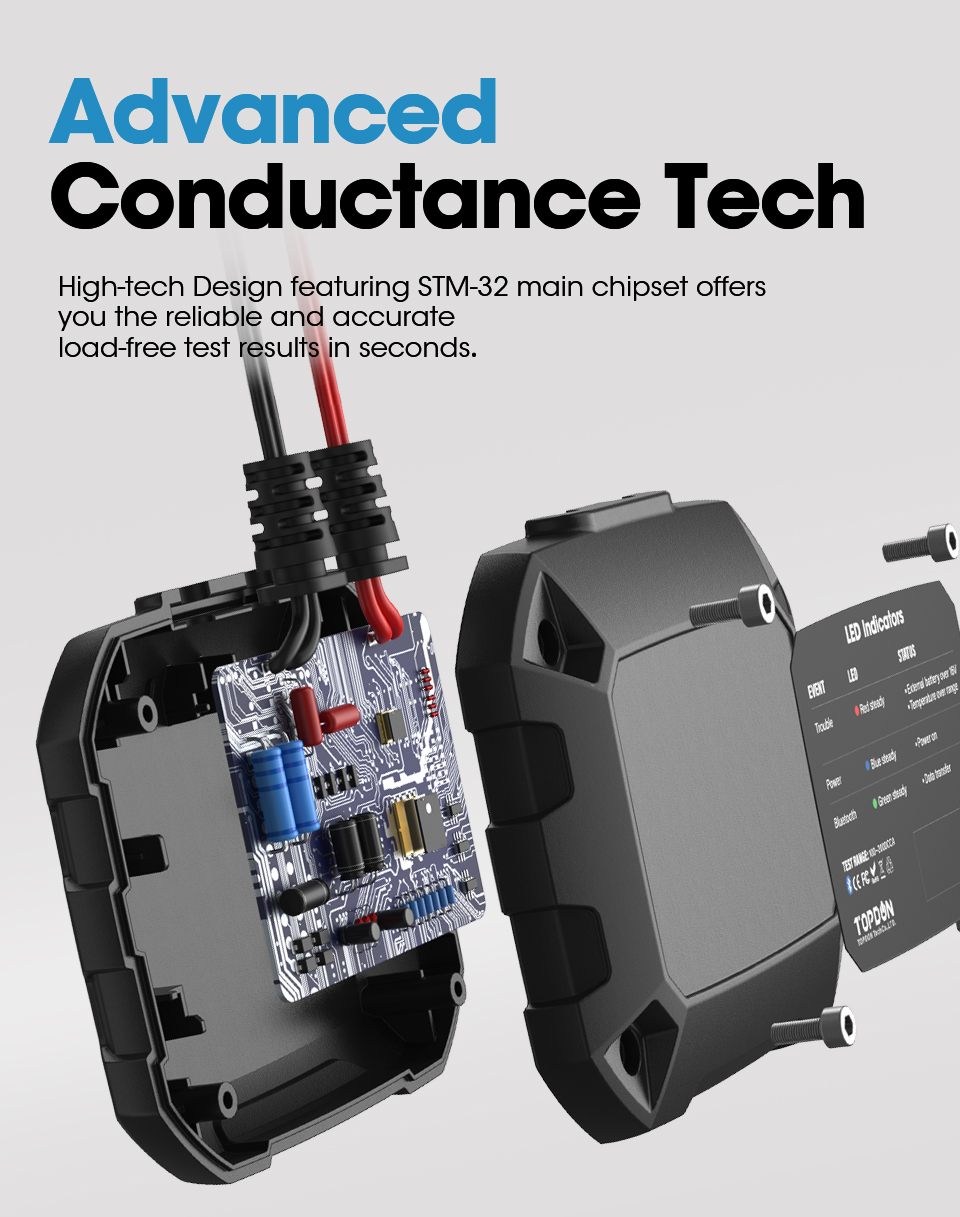 Darsteller STM-32 wichtigsten chipsatz und die erweiterte leitwert prüfung technologie, TOPDON BTMobile bietet sie die zuverlässige und genaue last-freies test ergebnisse in sekunden, mit keine notwendigkeit von voll aufladen der batterie.