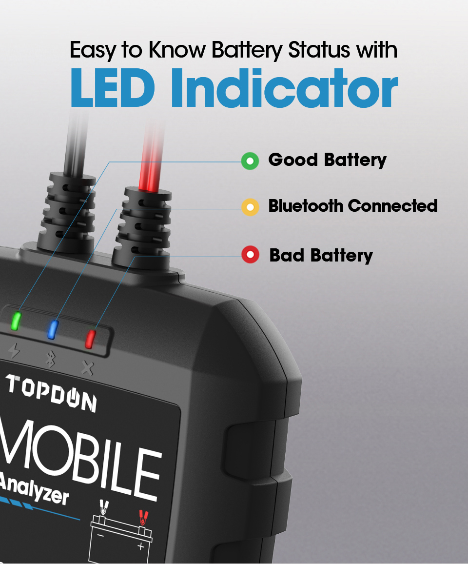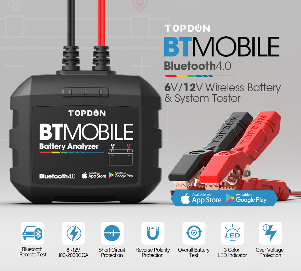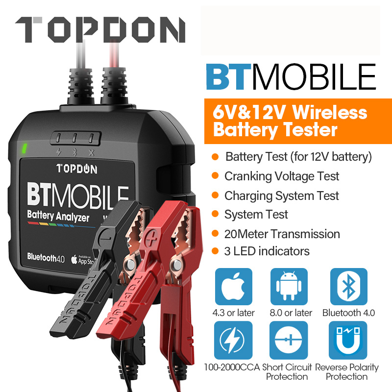 BTMobile, als TOPDON neue-freigegeben Bluetooth wireless automotive batterie tester, kombiniert die modernsten leitwert prüfung technologie zu geben benutzer genaue test ergebnisse von batterie zustand, ausgangs und lade system, mit reverse polarität schutz, etc., zu werden eine schnelle, sicher und einfach batterie test lösung für techniker, profis, und Heimwerker.